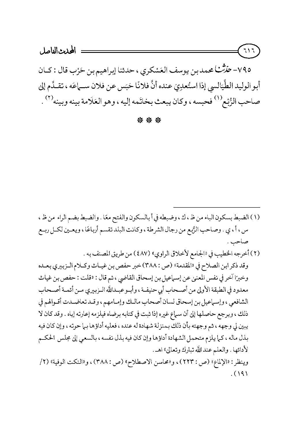 ٧٩٥ - حدثنا محمد بن يوسف العَسْكري، حدثنا إبراهيم بن حَرْب قال: كان أبو الوليد الطَّيَالسي إذا استُعدِيَ عنده أنَّ فلانًا حَبَس عن فلان سماعَه، تقدَّم إلى صاحب الرُّبْع (¬١) فحبسه، وكان يبعث بخاتَمه إليه، وهو العَلَامة بينه وبينه (¬٢).