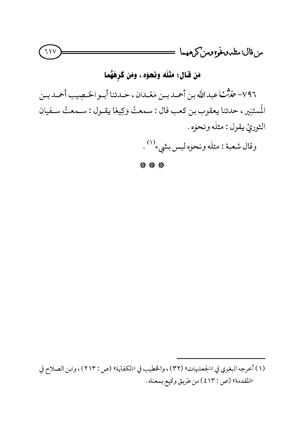 (¬١) أخرجه البغوي في «الجعديات» (٣٢)، والخطيب في «الكفاية» (ص: ٢١٣)، وابن الصلاح في «المقدمة» (ص: ٤١٣) من طريق وكيع بمعناه.