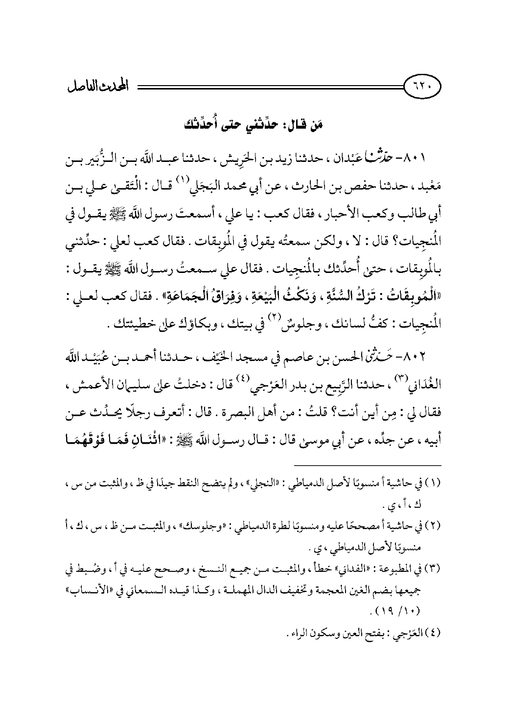 ٨٠١ - حدثنا عَبْدان، حدثنا زيد بن الحَرِيش، حدثنا عبد الله بن الزُّبَير بن مَعْبد، حدثنا حفص بن الحارث، عن أبي محمد البَجَلي (¬١) قال: الْتَقى علي بن أبي طالب وكعب الأحبار، فقال كعب: يا علي، أسمعتَ رسول الله - صلى الله عليه وسلم - يقول في المُنجِيات؟ قال: لا، ولكن سمعتُه يقول في المُوبِقات. فقال كعب لعلي: حدِّثني بالمُوبِقات، حتى أُحدِّثك بالمُنجِيات. فقال علي سمعتُ رسول الله - صلى الله عليه وسلم - يقول: «الْمُوبِقَاتُ: تَرْكُ السُّنَّةِ، وَنَكْثُ الْبَيْعَةِ، وَفِرَاقُ الْجَمَاعَةِ». فقال كعب لعلي: المُنجِيات: كفُّ لسانك، وجلوسٌ (¬٢) في بيتك، وبكاؤك على خطيئتك.