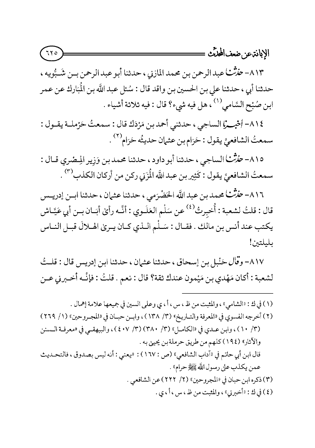٨١٤ - أخبرنا الساجي، حدثني أحمد بن مَرْدَك قال: سمعتُ حَرْملة يقول: سمعتُ الشافعيَّ يقول: حَرَام بن عثمان حديثُه حَرَام (¬٢).