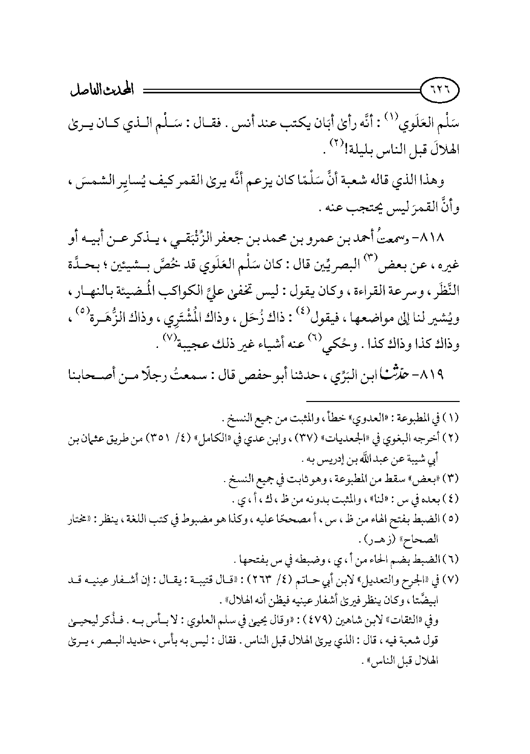 ٨١٨ - وسمعتُ أحمد بن عمرو بن محمد بن جعفر الزِّئْبَقي، يذكر عن أبيه أو غيره، عن بعض (¬٣) البصريِّين قال: كان سَلْم العَلَوي قد خُصَّ بشيئين؛ بحدَّة النَّظَر، وسرعة القراءة، وكان يقول: ليس تخفى عليَّ الكواكب المُضيئة بالنهار، ويُشير لنا إلى مواضعها، فيقول (¬٤): ذاك زُحَل، وذاك المُشْتَرِي، وذاك الزُّهَرة (¬٥)، وذاك كذا وذاك كذا. وحُكي (¬٦) عنه أشياء غير ذلك عجيبة (¬٧).