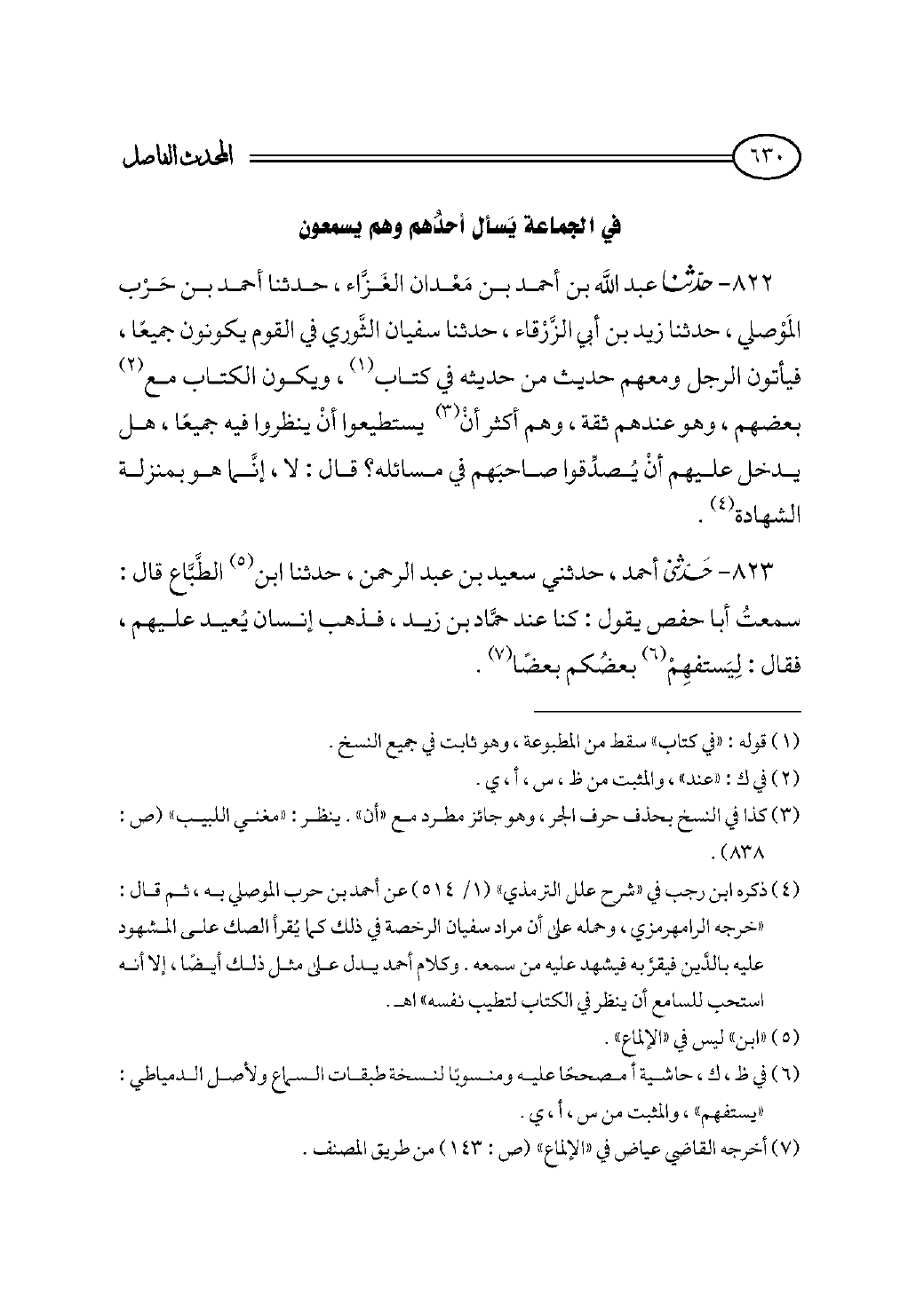 (¬٤) ذكره ابن رجب في «شرح علل الترمذي» (١/ ٥١٤) عن أحمد بن حرب الموصلي به، ثم قال: «خرجه الرامهرمزي، وحمله على أن مراد سفيان الرخصة في ذلك كما يُقرأ الصك على المشهود عليه بالدَّين فيقرَّ به فيشهد عليه من سمعه. وكلام أحمد يدل على مثل ذلك أيضًا، إلا أنه استحب للسامع أن ينظر في الكتاب لتطيب نفسه» اهـ.