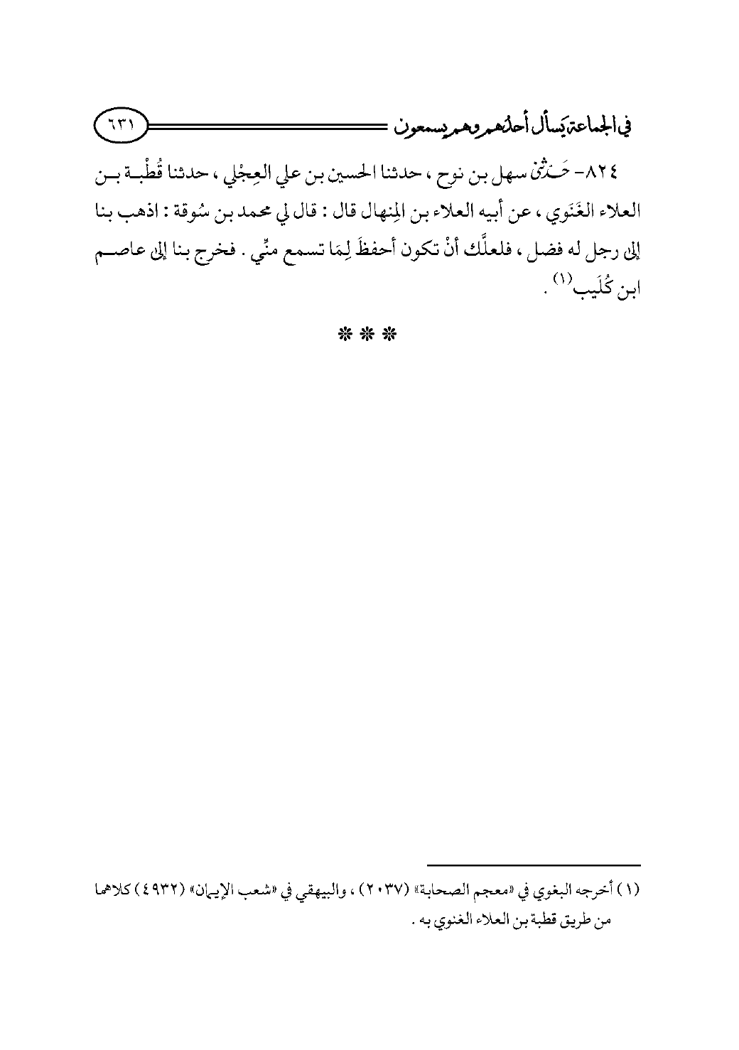 ٨٢٤ - حدثني سهل بن نوح، حدثنا الحسين بن علي العِجْلي، حدثنا قُطْبة بن العلاء الغَنَوي، عن أبيه العلاء بن المِنهال قال: قال لي محمد بن سُوقة: اذهب بنا إلى رجل له فضل، فلعلَّك أنْ تكون أحفظَ لِمَا تسمع منِّي. فخرج بنا إلى عاصم ابن كُلَيب (¬١).