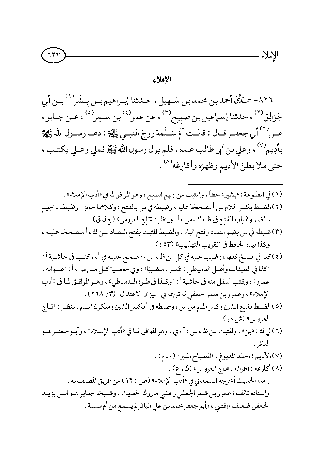 ٨٢٦ - حدثني أحمد بن محمد بن سُهيل، حدثنا إبراهيم بن بِشْر (¬١) بن أبي جُوَالِق (¬٢)، حدثنا إسماعيل بن صَبِيح (¬٣)، عن عمر (¬٤) بن شَمِر (¬٥)، عن جابر، عن (¬٦) أبي جعفر قال: قالت أمُّ سَلَمة زوجُ النبي - صلى الله عليه وسلم -: دعا رسول الله - صلى الله عليه وسلم - بأَدِيم (¬٧)، وعلي بن أبي طالب عنده، فلم يزل رسول الله - صلى الله عليه وسلم - يُملي وعلي يكتب، حتى ملأ بطنَ الأَديم وظهرَه وأكارِعَه (¬٨).