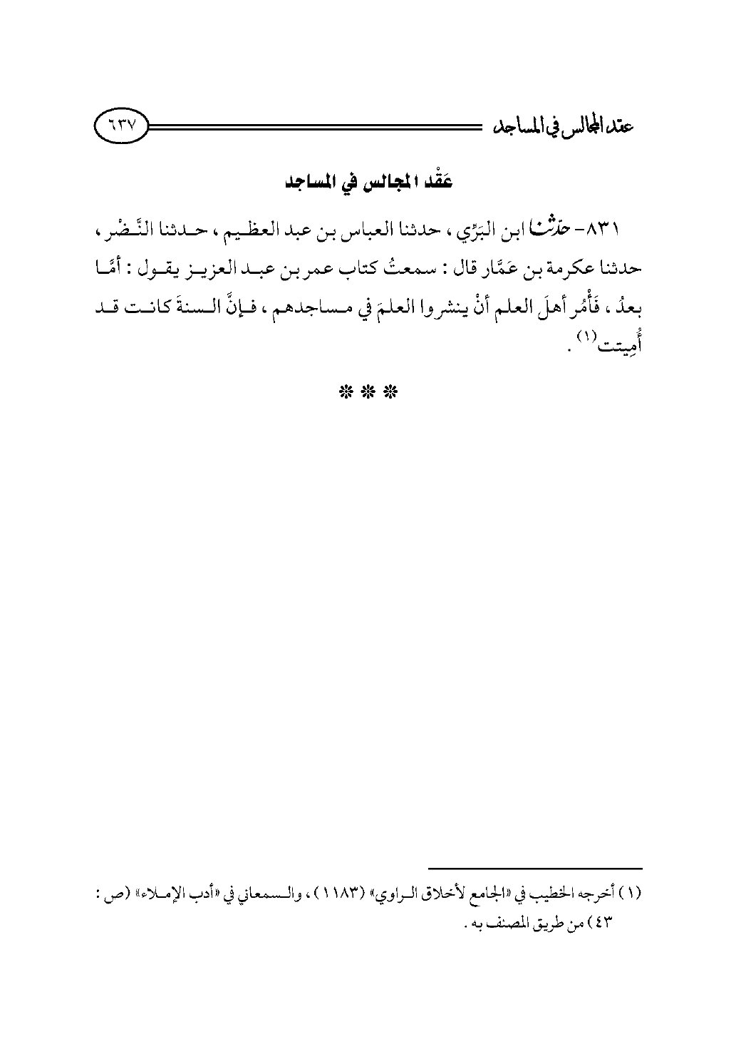 ٨٣١ - حدثنا ابن البَرِّي، حدثنا العباس بن عبد العظيم، حدثنا النَّضْر، حدثنا عكرمة بن عَمَّار قال: سمعتُ كتاب عمر بن عبد العزيز يقول: أمَّا بعدُ، فَأْمُر أهلَ العلم أنْ ينشروا العلمَ في مساجدهم، فإنَّ السنةَ كانت قد أُمِيتت (¬١).