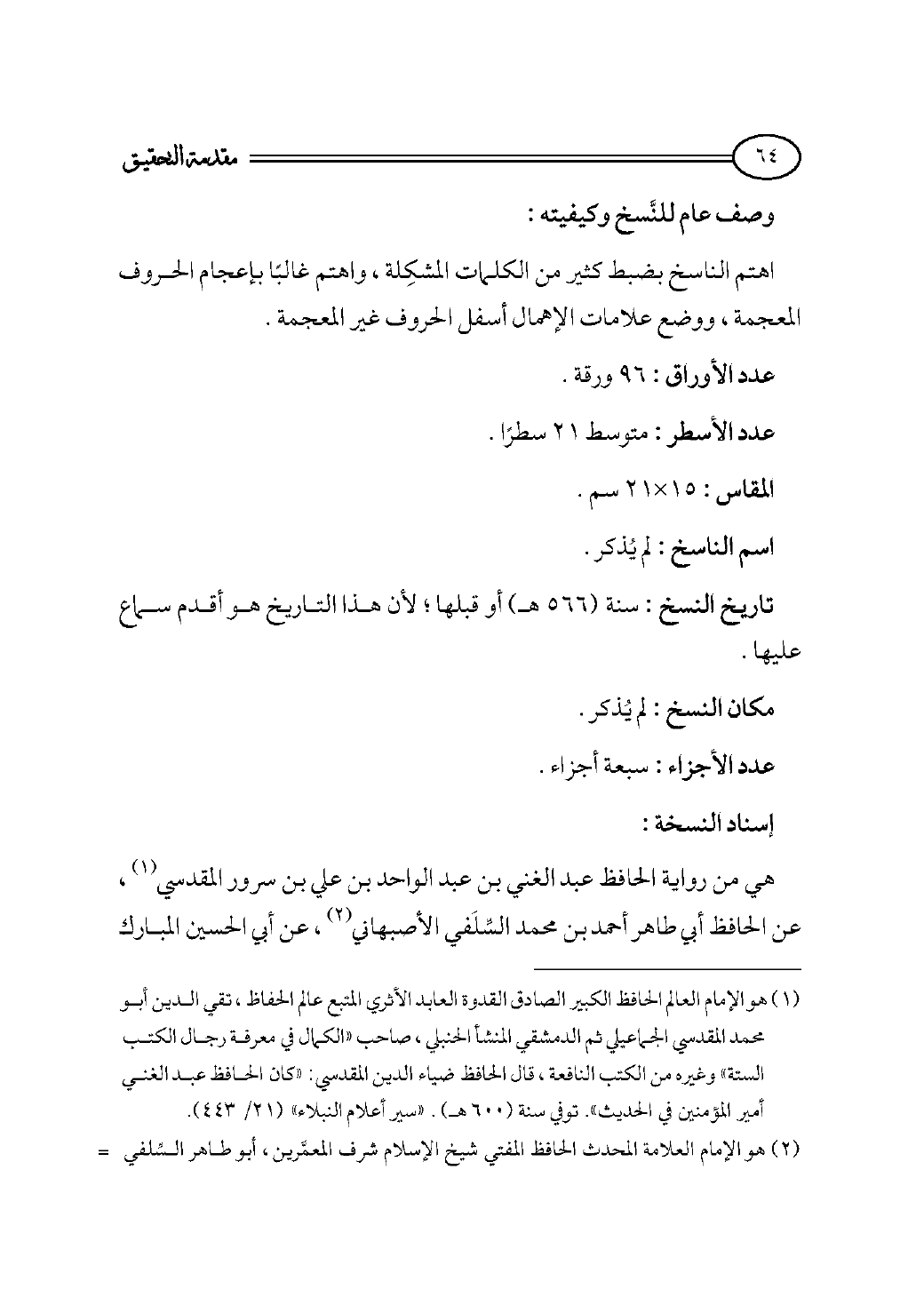 هي من رواية الحافظ عبد الغني بن عبد الواحد بن علي بن سرور المقدسي (¬١)، عن الحافظ أبي طاهر أحمد بن محمد السِّلَفي الأصبهاني (¬٢)، عن أبي الحسين المبارك