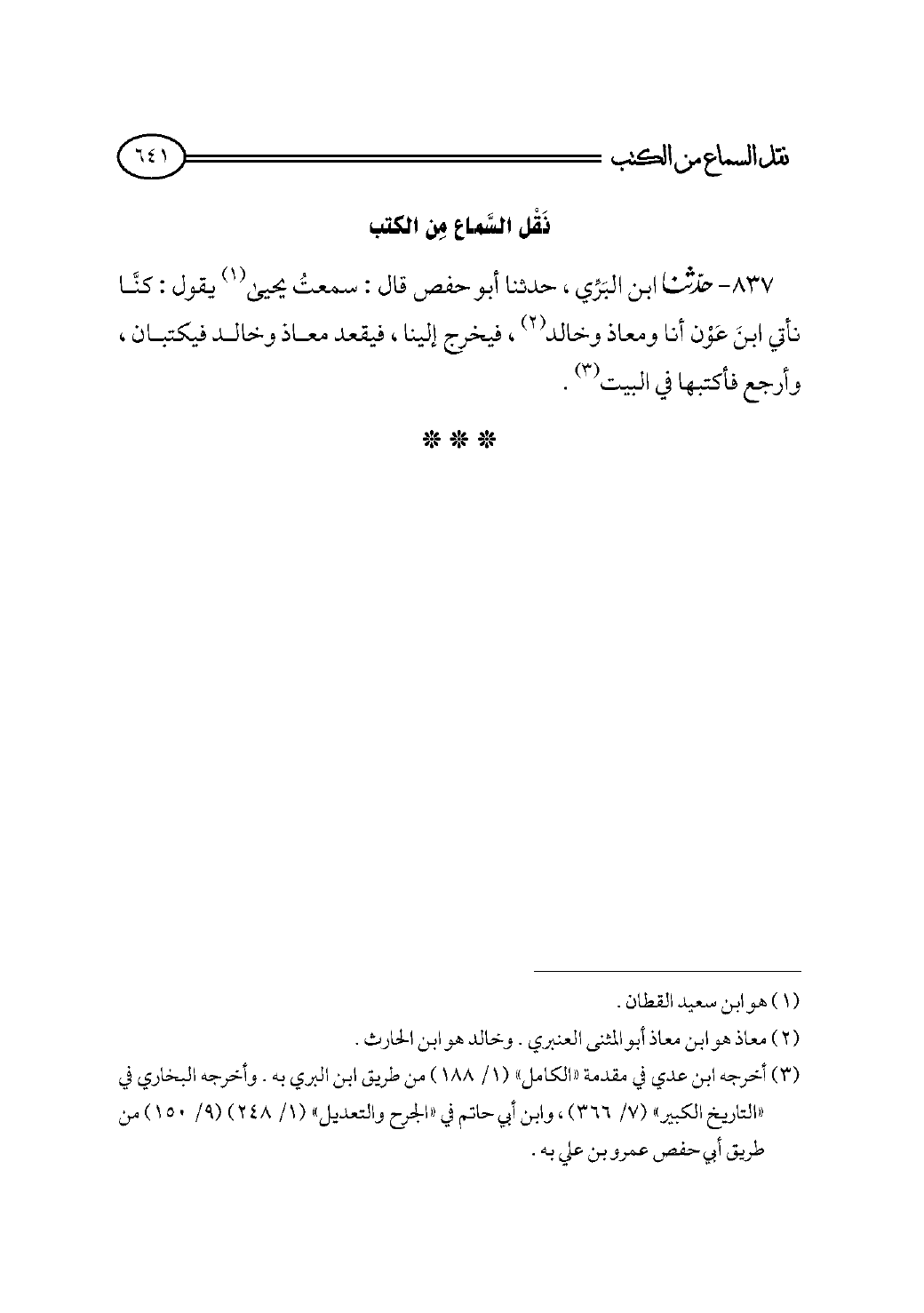 ٨٣٧ - حدثنا ابن البَرِّي، حدثنا أبو حفص قال: سمعتُ يحيى (¬١) يقول: كنَّا نأتي ابنَ عَوْن أنا ومعاذ وخالد (¬٢)، فيخرج إلينا، فيقعد معاذ وخالد فيكتبان، وأرجع فأكتبها في البيت (¬٣).