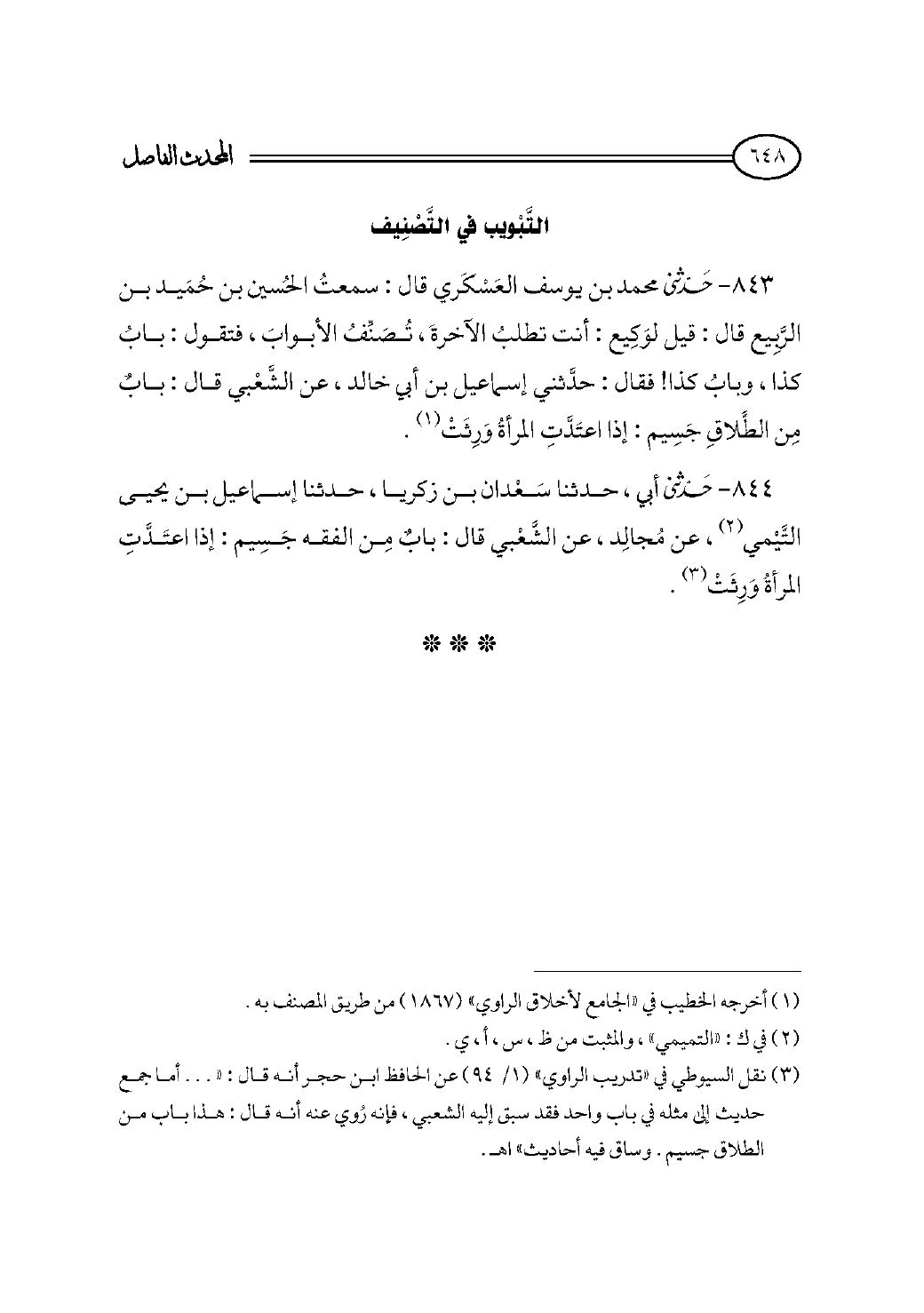 ٨٤٣ - حدثني محمد بن يوسف العَسْكَري قال: سمعتُ الحُسين بن حُمَيد بن الرَّبِيع قال: قيل لوَكِيع: أنت تطلبُ الآخرةَ، تُصَنِّفُ الأبوابَ، فتقول: بابُ كذا، وبابُ كذا! فقال: حدَّثني إسماعيل بن أبي خالد، عن الشَّعْبي قال: بابٌ مِن الطَّلاقِ جَسِيم: إذا اعتَدَّتِ المرأةُ وَرِثَتْ (¬١).