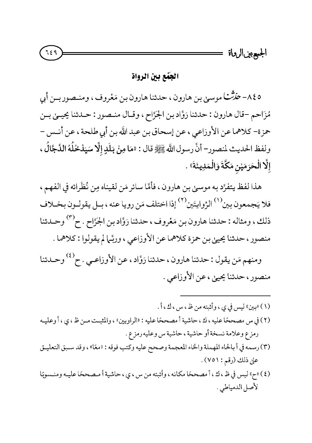 ٨٤٥ - حدثنا موسى بن هارون، حدثنا هارون بن مَعْروف، ومنصور بن أبي مُزَاحم -قال هارون: حدثنا رَوَّاد بن الجَرَّاح، وقال منصور: حدثنا يحيى بن حمزة- كلاهما عن الأوزاعي، عن إسحاق بن عبد الله بن أبي طلحة، عن أنس -ولفظ الحديث لمنصور- أنَّ رسول الله - صلى الله عليه وسلم - قال: «مَا مِنْ بَلَدٍ إِلَّا سَيَدْخُلُهُ الدَّجَّالُ، إِلَّا الْحَرَمَيْنِ مَكَّةَ وَالْمَدِينَةَ».
