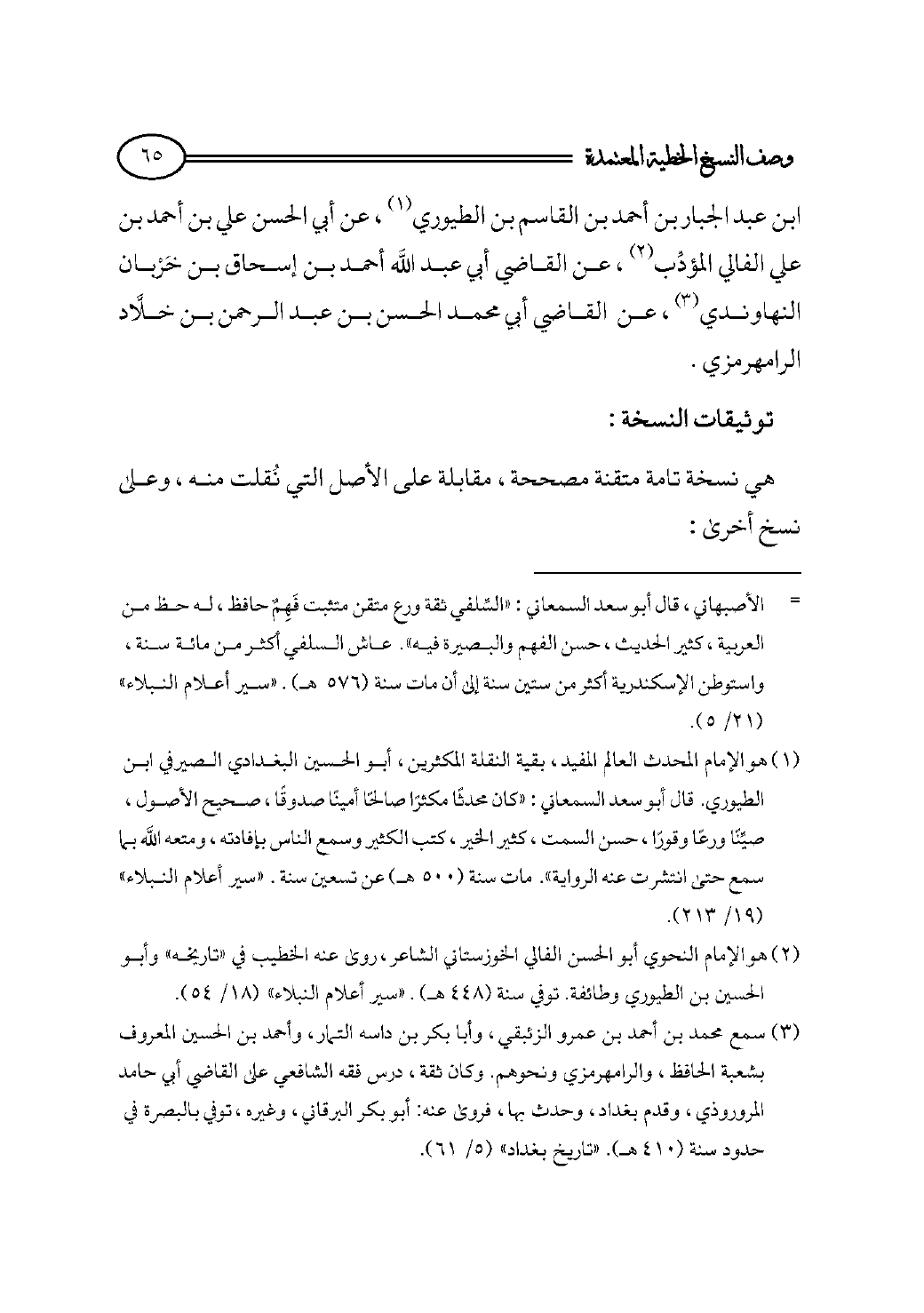 (¬١) هو الإمام المحدث العالم المفيد، بقية النقلة المكثرين، أبو الحسين البغدادي الصيرفي ابن الطيوري. قال أبو سعد السمعاني: «كان محدثًا مكثرًا صالحًا أمينًا صدوقًا، صحيح الأصول، صيِّنًا ورعًا وقورًا، حسن السمت، كثير الخير، كتب الكثير وسمع الناس بإفادته، ومتعه الله بما سمع حتى انتشرت عنه الرواية». مات سنة (٥٠٠ هـ) عن تسعين سنة. «سير أعلام النبلاء» (١٩/ ٢١٣) ..