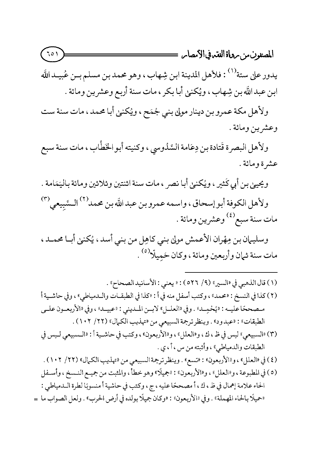 يدور على ستة (¬١): فلأهل المدينة ابن شِهاب، وهو محمد بن مسلم بن عُبيد الله ابن عبد الله بن شِهاب، ويُكنى أبا بكر، مات سنة أربع وعشرين ومائة.
