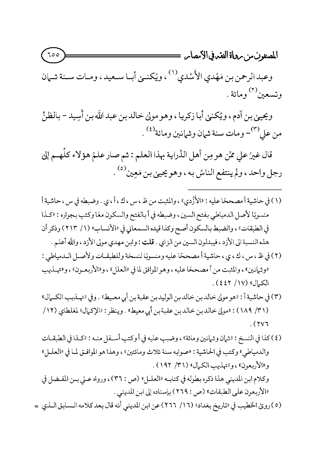 (¬٥) روى الخطيب في «تاريخ بغداد» (١٦/ ٢٦٦) عن ابن المديني أنه قال بعد كلامه السابق الذي ذكره المصنف: «فصار علم هؤلاء جميعًا إلى يحيى بن معين». وأورد نحوه المزي في «تهذيب الكمال» من رواية أبي زرعة الرازي وأبي قلابة الرقاشي عن ابن المديني (٣١/ ٥٥٠) ثم ذكر أن أبا زرعة قال: «ولم يُنتفع به - يعني بابن معين- لأنه كان يتكلم في الناس».