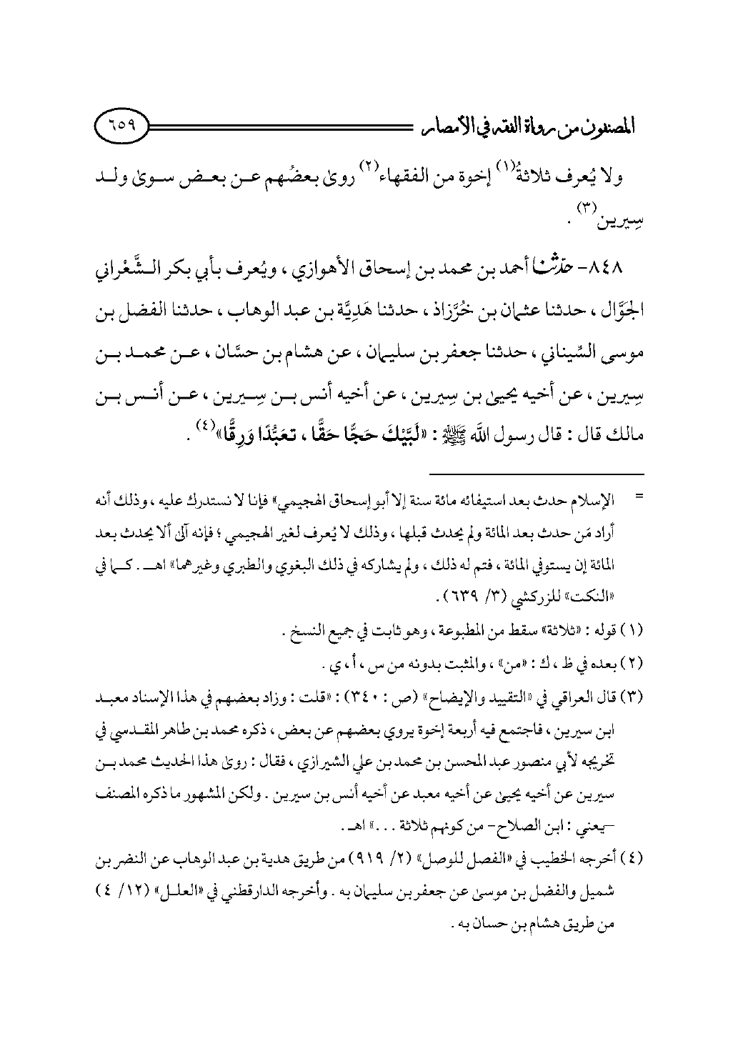 (¬٣) قال العراقي في «التقييد والإيضاح» (ص: ٣٤٠): «قلت: وزاد بعضهم في هذا الإسناد معبد ابن سيرين، فاجتمع فيه أربعة إخوة يروي بعضهم عن بعض، ذكره محمد بن طاهر المقدسي في تخريجه لأبي منصور عبد المحسن بن محمد بن علي الشيرازي، فقال: روى هذا الحديث محمد بن سيرين عن أخيه يحيى عن أخيه معبد عن أخيه أنس بن سيرين. ولكن المشهور ما ذكره المصنف -يعني: ابن الصلاح- من كونهم ثلاثة ... » اهـ.