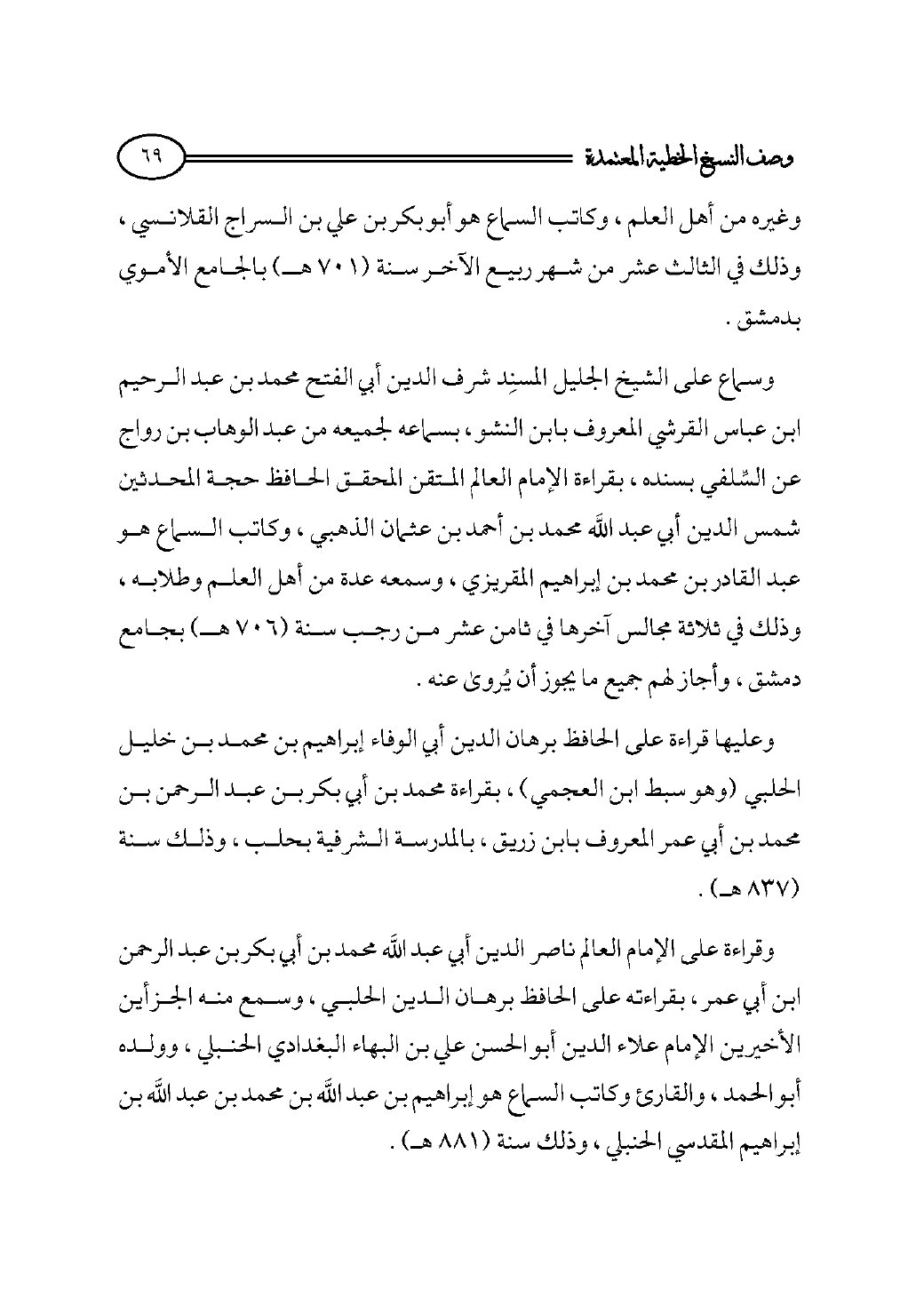 وغيره من أهل العلم، وكاتب السماع هو أبو بكر بن علي بن السراج القلانسي، وذلك في الثالث عشر من شهر ربيع الآخر سنة (٧٠١ هـ) بالجامع الأموي بدمشق.