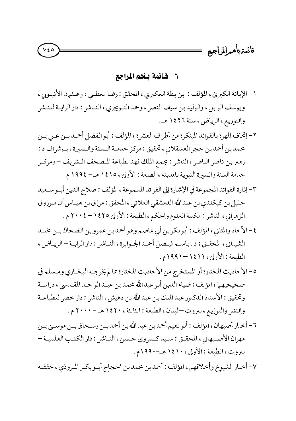 ٢ - إتحاف المهرة بالفوائد المبتكرة من أطراف العشرة، المؤلف: أبو الفضل أحمد بن علي بن محمد بن أحمد بن حجر العسقلاني، تحقيق: مركز خدمة السنة والسيرة، بإشراف د: زهير بن ناصر الناصر، الناشر: مجمع الملك فهد لطباعة المصحف الشريف - ومركز خدمة السنة والسيرة النبوية بالمدينة، الطبعة: الأولى، ١٤١٥ هـ - ١٩٩٤ م.