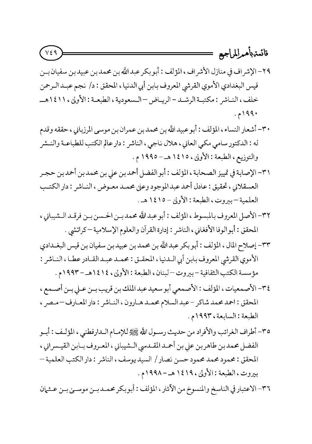 ٢٩ - الإشراف في منازل الأشراف، المؤلف: أبو بكر عبد الله بن محمد بن عبيد بن سفيان بن قيس البغدادي الأموي القرشي المعروف بابن أبي الدنيا، المحقق: د/ نجم عبد الرحمن خلف، الناشر: مكتبة الرشد - الرياض - السعودية، الطبعة: الأولى، ١٤١١ هـ ١٩٩٠ م.