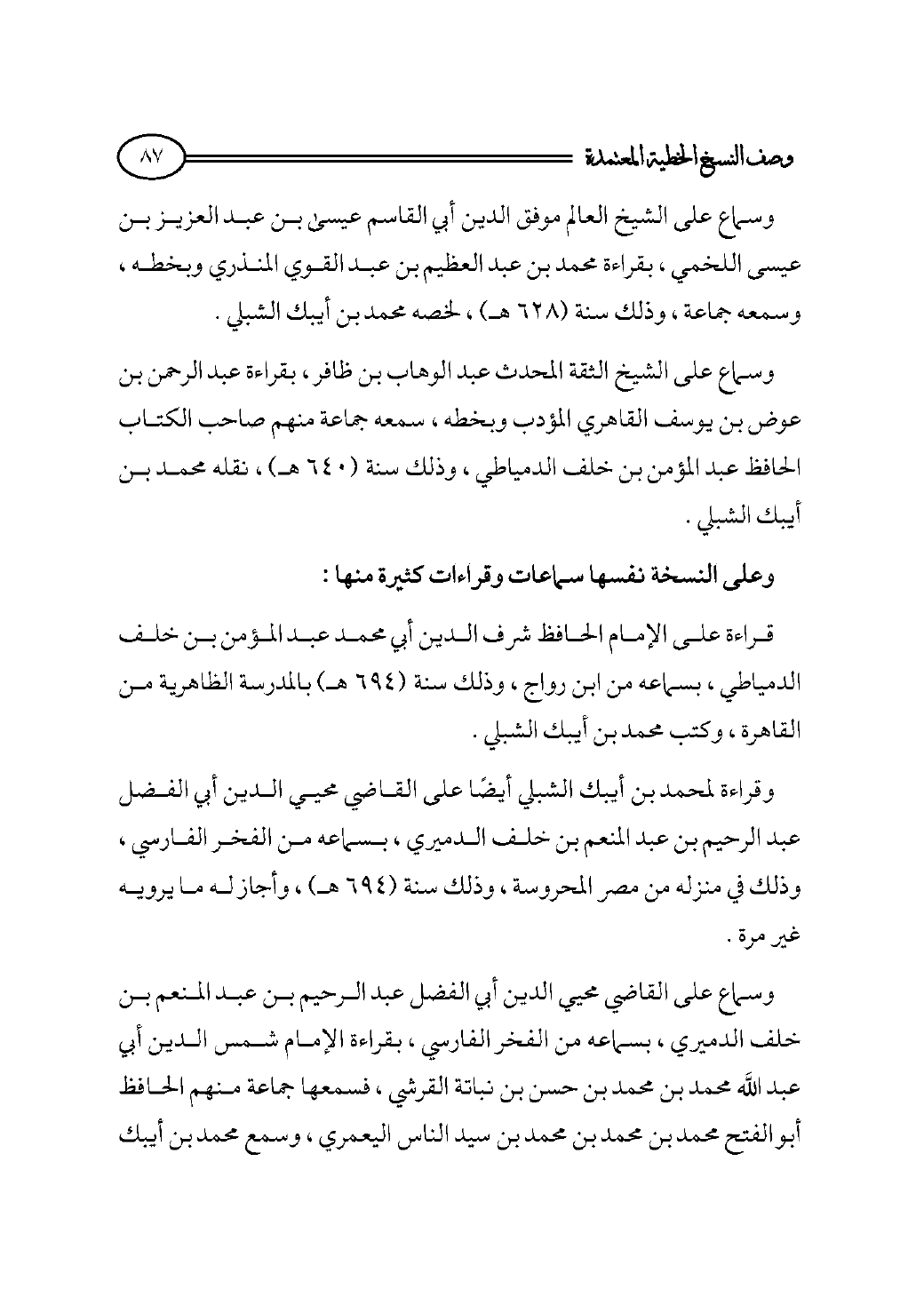 قراءة على الإمام الحافظ شرف الدين أبي محمد عبد المؤمن بن خلف الدمياطي، بسماعه من ابن رواج، وذلك سنة (٦٩٤ هـ) بالمدرسة الظاهرية من القاهرة، وكتب محمد بن أيبك الشبلي.