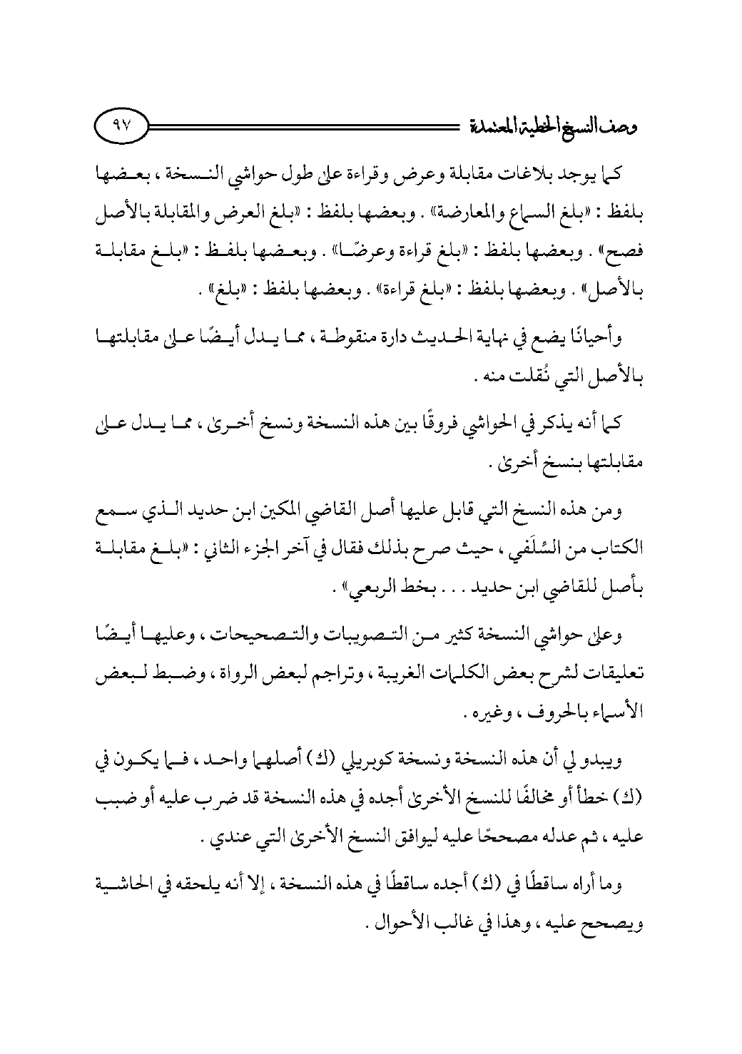 كما يوجد بلاغات مقابلة وعرض وقراءة على طول حواشي النسخة، بعضها بلفظ: «بلغ السماع والمعارضة». وبعضها بلفظ: «بلغ العرض والمقابلة بالأصل فصح». وبعضها بلفظ: «بلغ قراءة وعرضًا». وبعضها بلفظ: «بلغ مقابلة بالأصل». وبعضها بلفظ: «بلغ قراءة». وبعضها بلفظ: «بلغ».