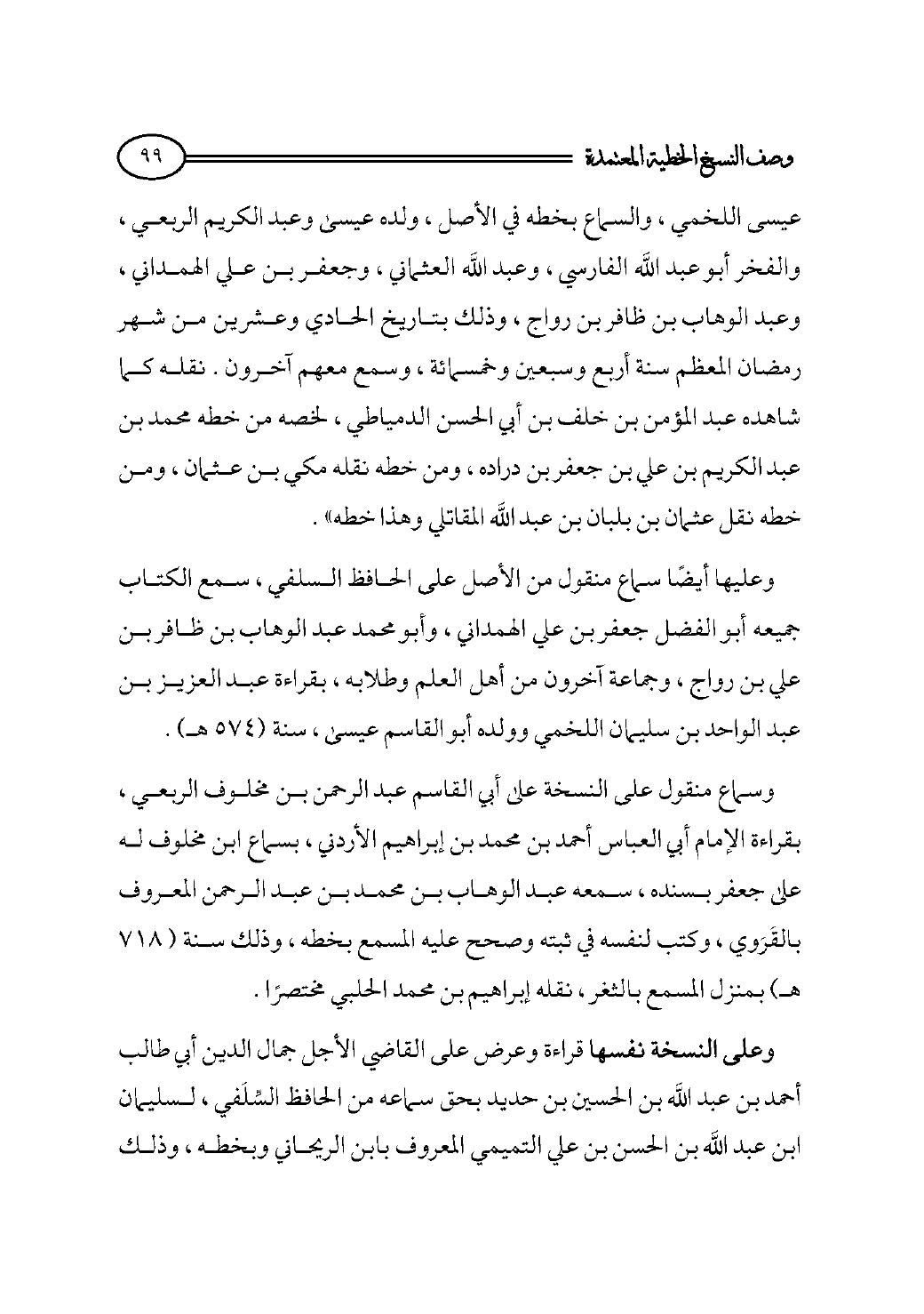 عيسى اللخمي، والسماع بخطه في الأصل، ولده عيسى وعبد الكريم الربعي، والفخر أبو عبد الله الفارسي، وعبد الله العثماني، وجعفر بن علي الهمداني، وعبد الوهاب بن ظافر بن رواج، وذلك بتاريخ الحادي وعشرين من شهر رمضان المعظم سنة أربع وسبعين وخمسمائة، وسمع معهم آخرون. نقله كما شاهده عبد المؤمن بن خلف بن أبي الحسن الدمياطي، لخصه من خطه محمد بن عبد الكريم بن علي بن جعفر بن دراده، ومن خطه نقله مكي بن عثمان، ومن خطه نقل عثمان بن بلبان بن عبد الله المقاتلي وهذا خطه».