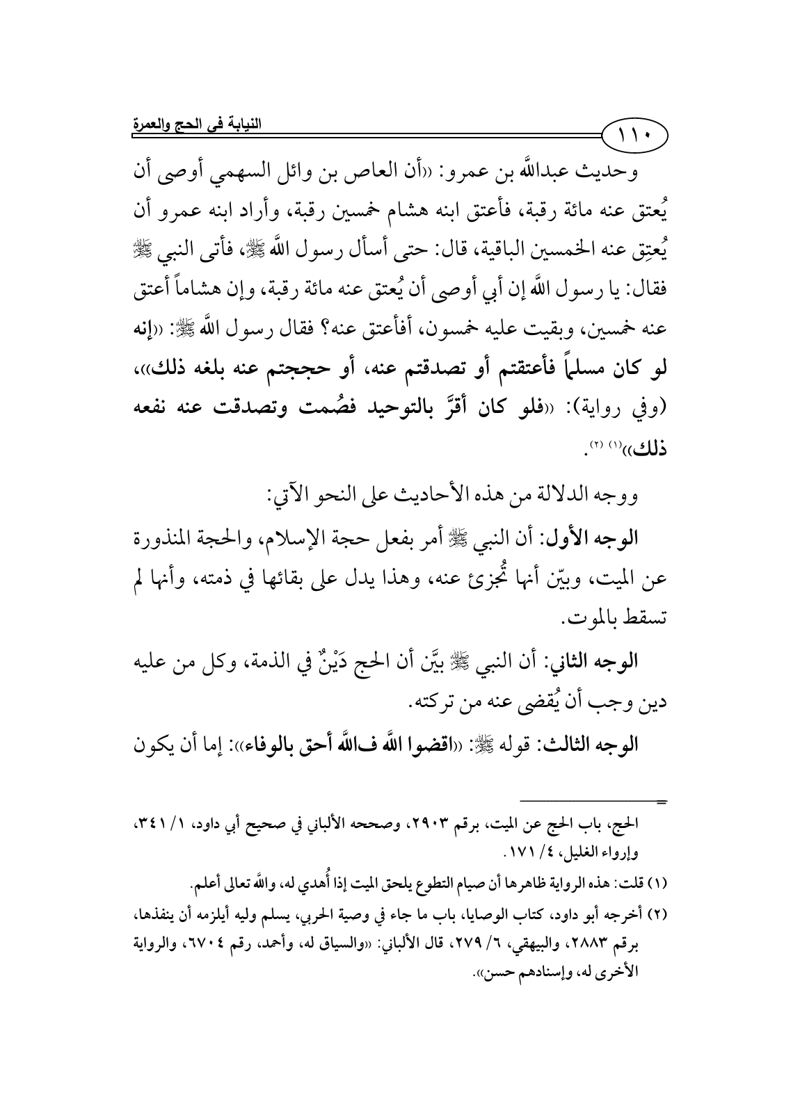 وحديث عبد اللَّه بن عمرو: ((أن العاص بن وائل السهمي أوصى أن يُعتق عنه مائة رقبة، فأعتق ابنه هشام خمسين رقبة، وأراد ابنه عمرو أن يُعتِق عنه الخمسين الباقية، قال: حتى أسأل رسول اللَّه - صلى الله عليه وسلم -، فأتى النبي - صلى الله عليه وسلم - فقال: يا رسول اللَّه إن أبي أوصى أن يُعتق عنه مائة رقبة، وإن هشاماً أعتق عنه خمسين، وبقيت عليه خمسون، أفأعتق عنه؟ فقال رسول اللَّه - صلى الله عليه وسلم -: ((إنه لو كان مسلماً فأعتقتم أو تصدقتم عنه، أو حججتم عنه بلغه ذلك))، (وفي رواية): ((فلو كان أقرَّ بالتوحيد فصُمت وتصدقت عنه نفعه ذلك)) (¬1) (¬2).
