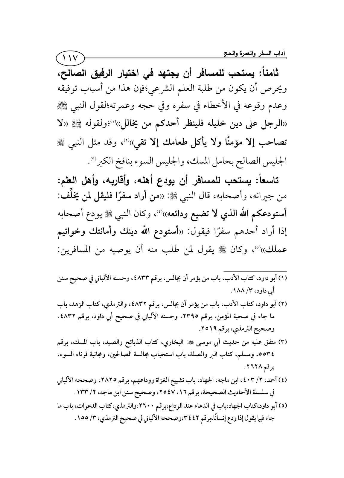 ثامناً: يستحب للمسافر أن يجتهد في اختيار الرفيق الصالح، ويحرص أن يكون من طلبة العلم الشرعي؛ فإن هذا من أسباب توفيقه وعدم وقوعه في الأخطاء في سفره وفي حجه وعمرته؛ لقول النبي - صلى الله عليه وسلم - ((الرجل على دين خليله فلينظر أحدكم من يخالل)) (¬1)؛ولقوله - صلى الله عليه وسلم - ((لا تصاحب إلا مؤمنًا ولا يأكل طعامك إلا تقي)) (¬2)، وقد مثل النبي - صلى الله عليه وسلم - الجليس الصالح بحامل المسك، والجليس السوء بنافخ الكير (¬3).