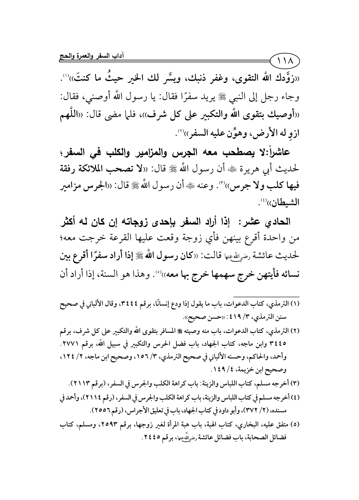 عاشراً: لا يصطحب معه الجرس والمزامير والكلب في السفر؛ لحديث أبي هريرة - رضي الله عنه - أن رسول اللَّه - صلى الله عليه وسلم - قال: ((لا تصحب الملائكة رفقة فيها كلب ولا جرس)) (¬3). وعنه - رضي الله عنه - أن رسول اللَّه - صلى الله عليه وسلم - قال: ((الجرس مزامير الشيطان)) (¬4).