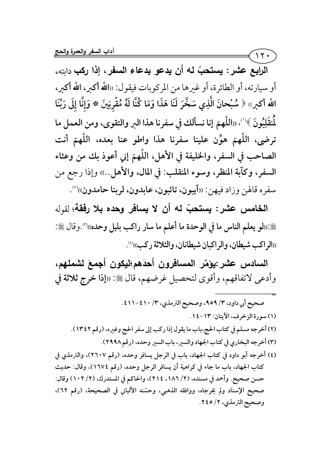 الخامس عشر: يستحبّ له أن لا يسافر وحده بلا رفقة؛ لقوله - صلى الله عليه وسلم -: ((لو يعلم الناس ما في الوحدة ما أعلم ما سار راكب بليل وحده)) (¬3).وقال - صلى الله عليه وسلم -: ((الراكب شيطان، والراكبان شيطانان، والثلاثة ركب)) (¬4).