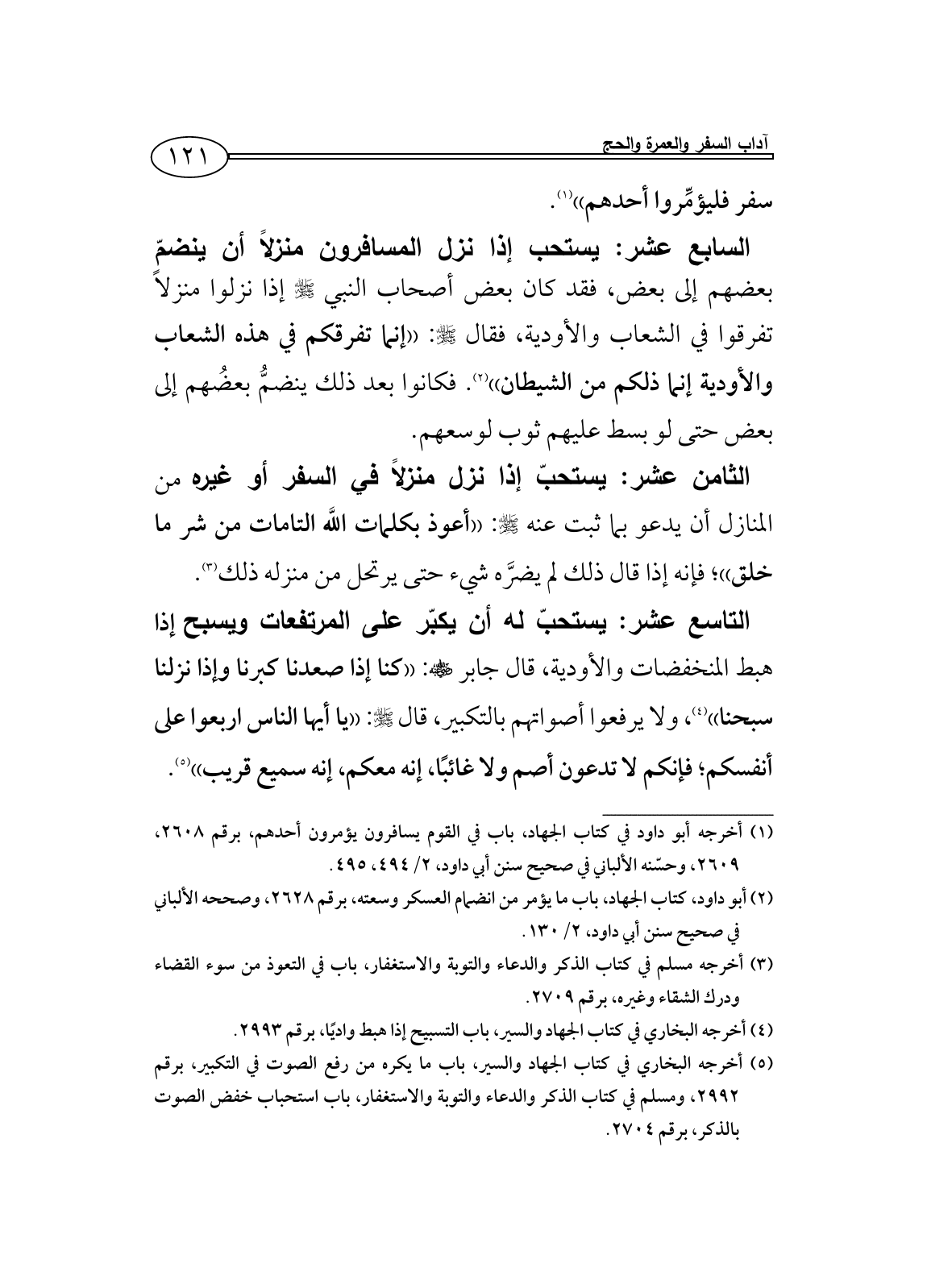 السابع عشر: يستحب إذا نزل المسافرون منزلاً أن ينضمّ بعضهم إلى بعض، فقد كان بعض أصحاب النبي - صلى الله عليه وسلم - إذا نزلوا منزلاً تفرقوا في الشعاب والأودية، فقال - صلى الله عليه وسلم -: ((إنما تفرقكم في هذه الشعاب والأودية إنما ذلكم من الشيطان)) (¬2). فكانوا بعد ذلك ينضمُّ بعضُهم إلى بعض حتى لو بسط عليهم ثوب لوسعهم.