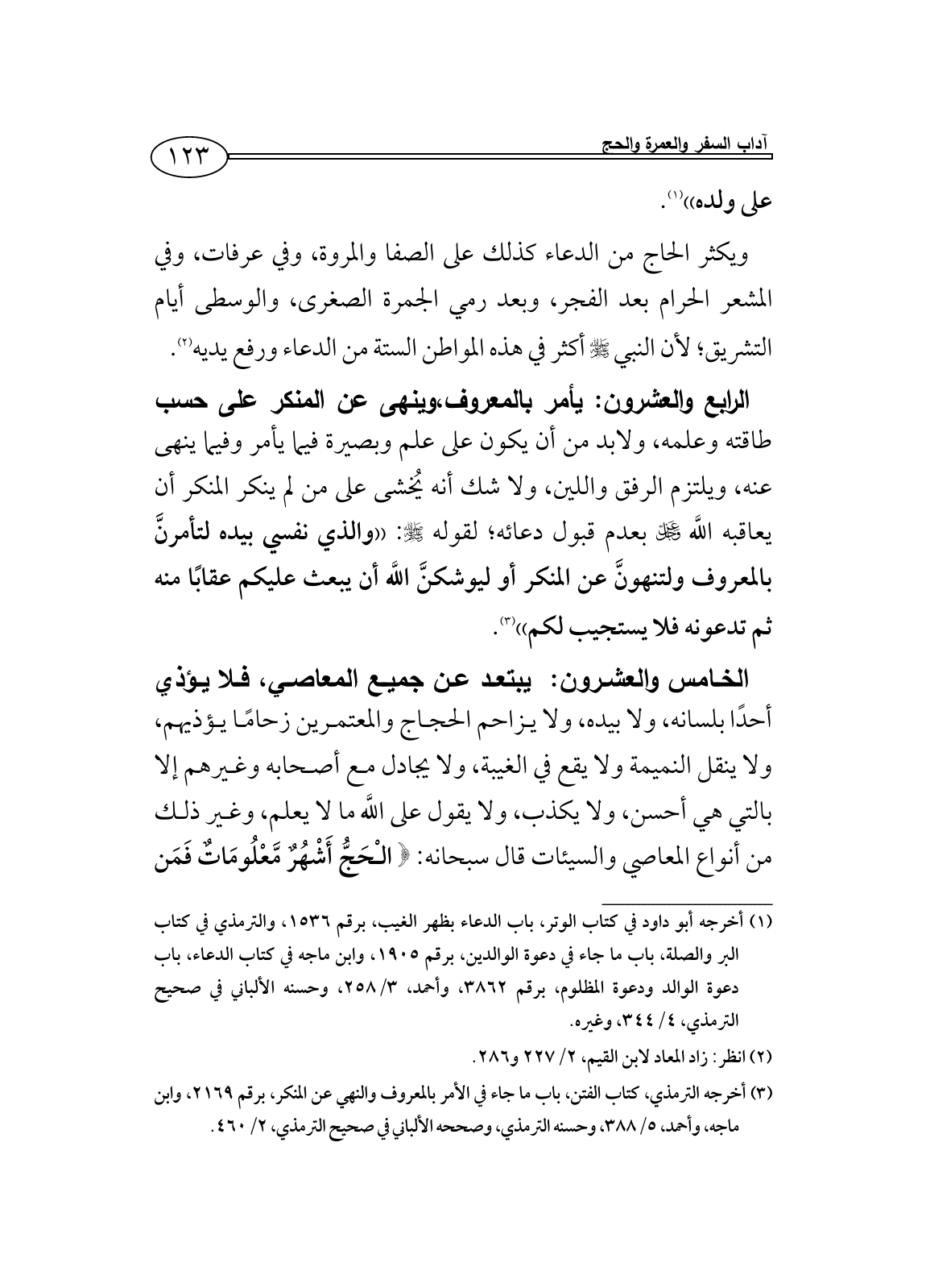 الخامس والعشرون: يبتعد عن جميع المعاصي، فلا يؤذي أحدًا بلسانه، ولا بيده، ولا يزاحم الحجاج والمعتمرين زحامًا يؤذيهم، ولا ينقل النميمة ولا يقع في الغيبة، ولا يجادل مع أصحابه وغيرهم إلا بالتي هي أحسن، ولا يكذب، ولا يقول على اللَّه ما لا يعلم، وغير ذلك من أنواع المعاصي والسيئات قال سبحانه: {الْحَجُّ أَشْهُرٌ مَّعْلُومَاتٌ فَمَن