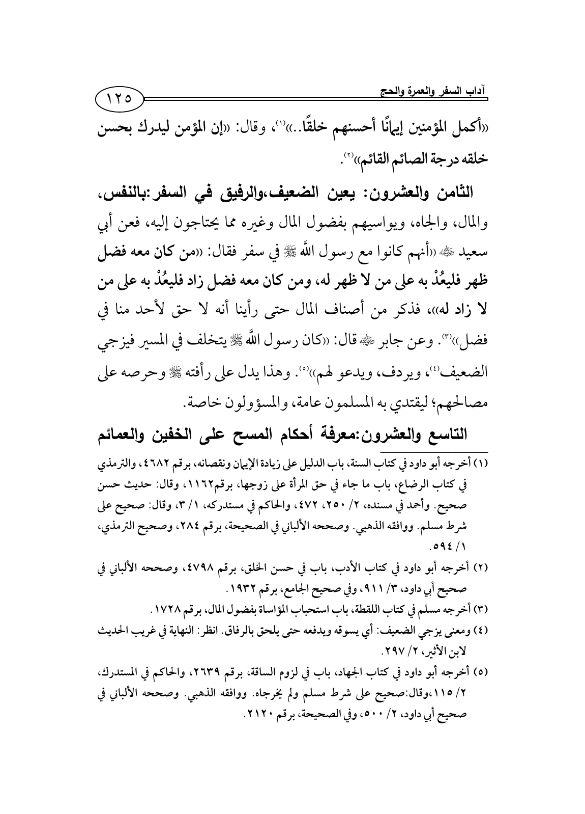 الثامن والعشرون: يعين الضعيف، والرفيق في السفر: بالنفس، والمال، والجاه، ويواسيهم بفضول المال وغيره مما يحتاجون إليه، فعن أبي سعيد - رضي الله عنه - ((أنهم كانوا مع رسول اللَّه - صلى الله عليه وسلم - في سفر فقال: ((من كان معه فضل ظهر فليعُدْ به على من لا ظهر له، ومن كان معه فضل زاد فليعُدْ به على من لا زاد له))، فذكر من أصناف المال حتى رأينا أنه لا حق لأحد منا في