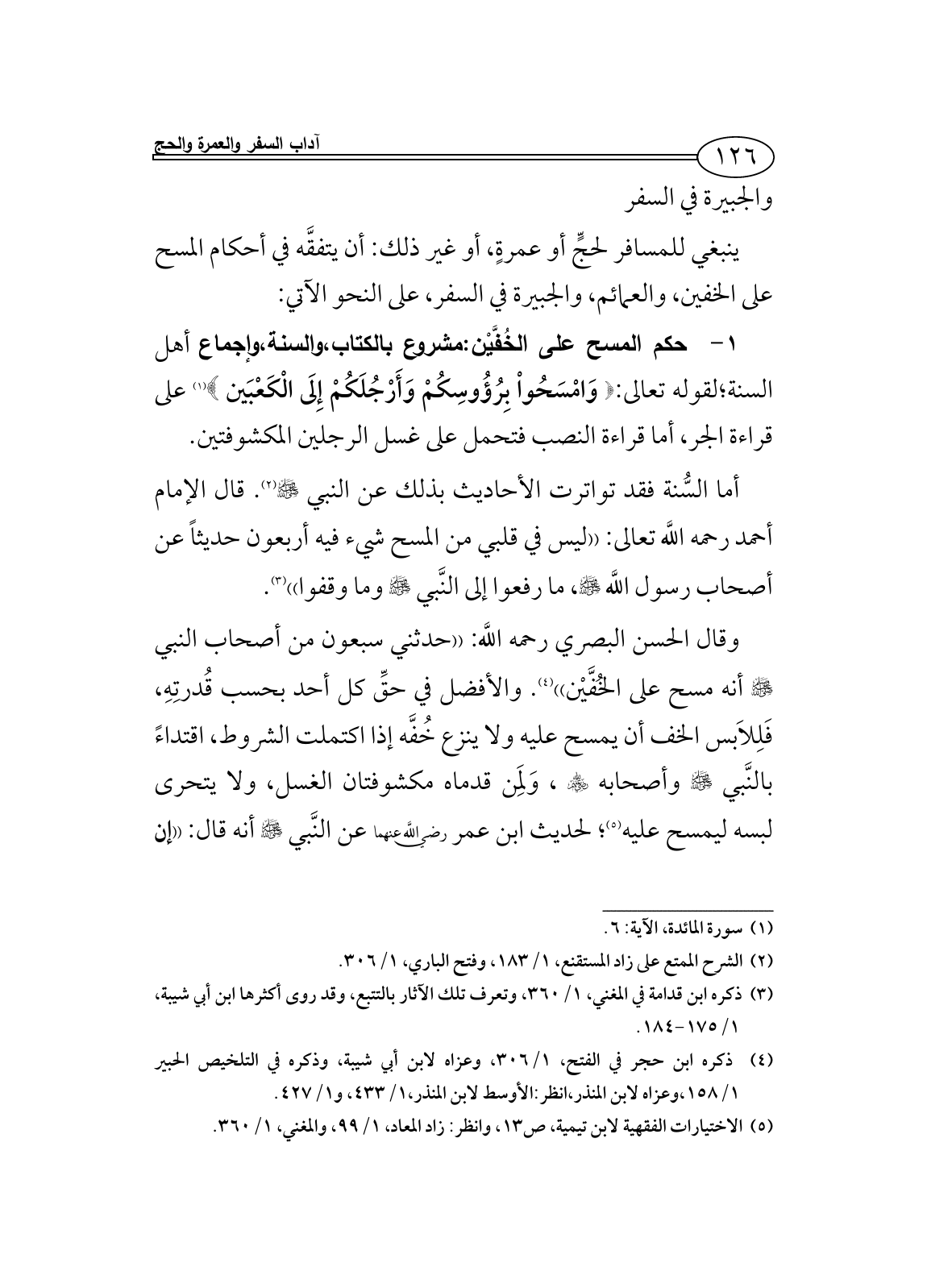ينبغي للمسافر لحجٍّ أو عمرةٍ، أو غير ذلك: أن يتفقَّه في أحكام المسح على الخفين، والعمائم، والجبيرة في السفر، على النحو الآتي: