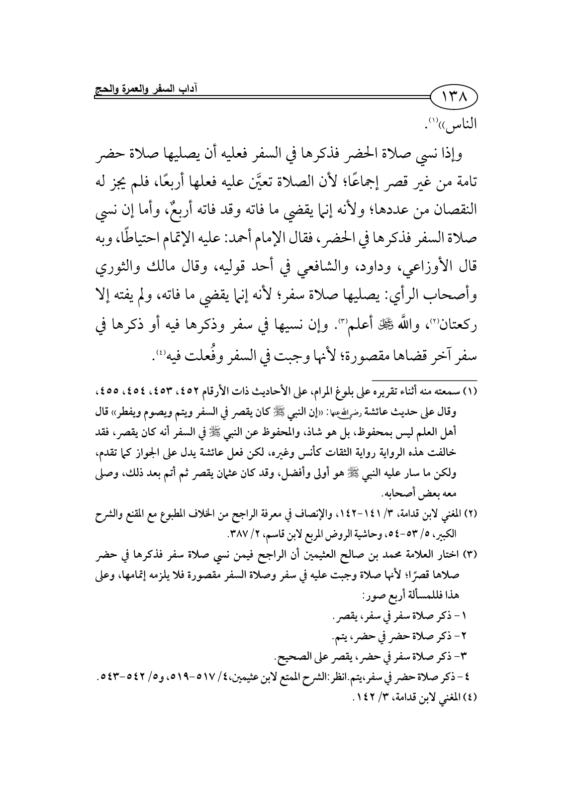 (¬3) اختار العلامة محمد بن صالح العثيمين أن الراجح فيمن نسي صلاة سفر فذكرها في حضر صلاها قصرًا؛ لأنها صلاة وجبت عليه في سفر وصلاة السفر مقصورة فلا يلزمه إتمامها، وعلى هذا فللمسألة أربع صور: