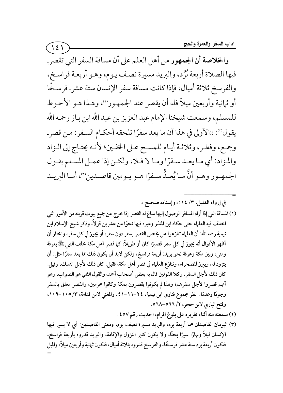 (¬3) اليومان القاصدان هما أربعة برد، والبريد مسيرة نصف يوم، ومعنى القاصدين: أي لا يسير فيها الإنسان ليلاً ونهارًا سيرًا بحتًا، ولا يكون كثير النزول والإقامة، والبريد قدروه بأربعة فراسخ، فتكون أربعة برد ستة عشر فرسخًا، والفرسخ قدروه بثلاثة أميال، فتكون ثمانية وأربعين ميلاً، والميل المعروف ألف وستمائة متر، فتكون الأربعة برد =76.8 كيلو تقريبًا، وقيل: 80.64 كيلو، وقيل: 72، قال العلامة محمد بن صالح العثيمين رحمه اللَّه: والميل المعروف = كيلو وستين في المائة. انظر: الشرح الممتع،4/ 496، تيسير العلام للبسام،1/ 273،والفتح الرباني للبنا، 5/ 108.