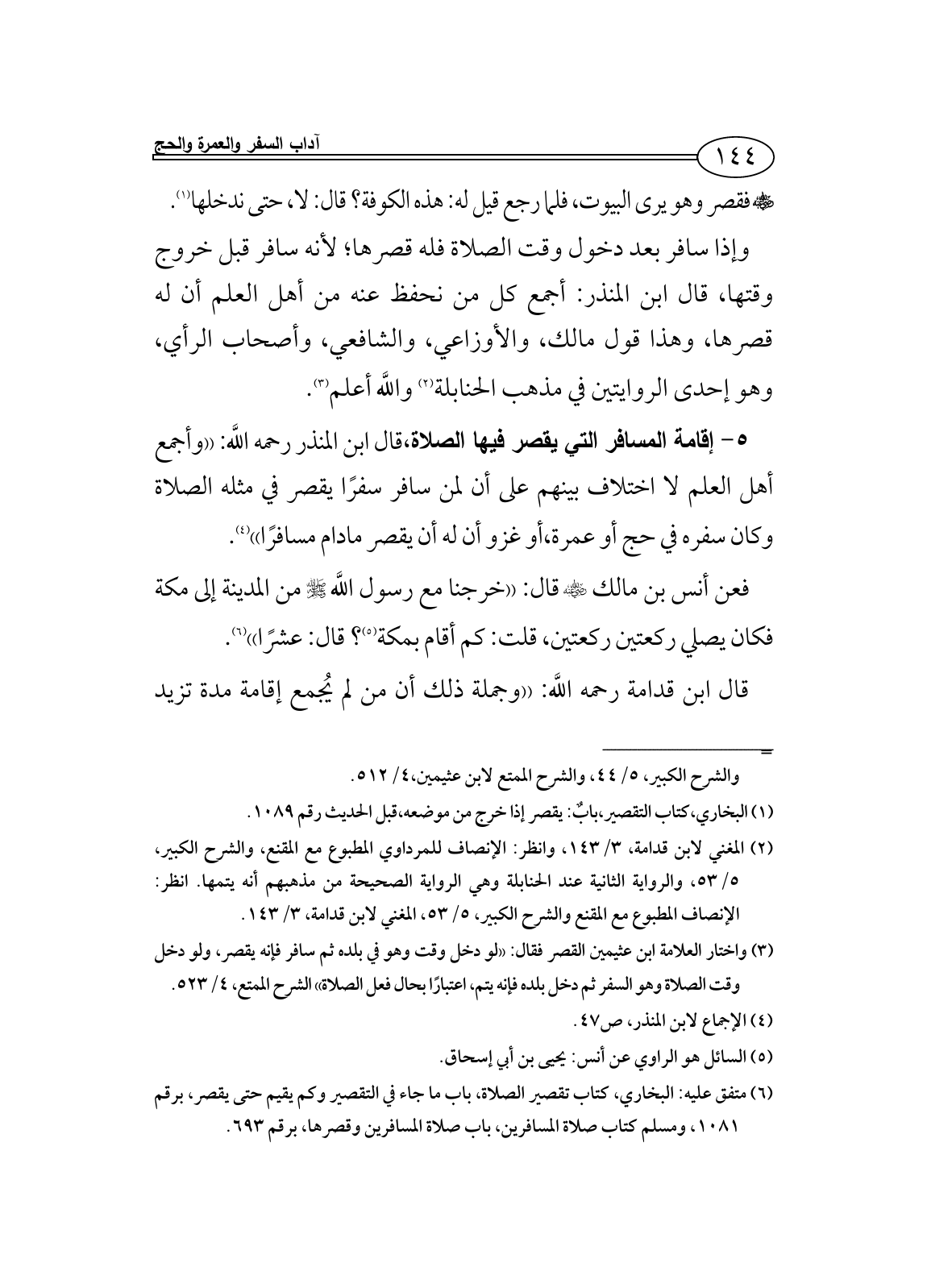 5 - إقامة المسافر التي يقصر فيها الصلاة، قال ابن المنذر رحمه اللَّه: ((وأجمع أهل العلم لا اختلاف بينهم على أن لمن سافر سفرًا يقصر في مثله الصلاة وكان سفره في حج أو عمرة، أو غزو أن له أن يقصر مادام مسافرًا)) (¬4).