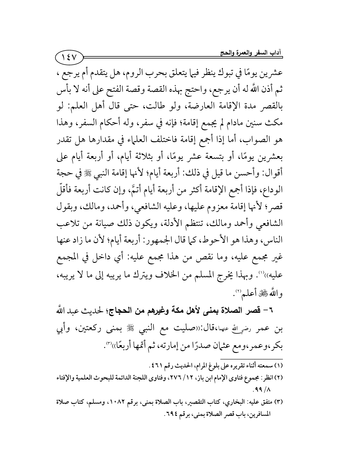 عشرين يومًا في تبوك ينظر فيما يتعلق بحرب الروم، هل يتقدم أم يرجع، ثم أذن اللَّه له أن يرجع، واحتج بهذه القصة وقصة الفتح على أنه لا بأس بالقصر مدة الإقامة العارضة، ولو طالت، حتى قال أهل العلم: لو مكث سنين مادام لم يجمع إقامة؛ فإنه في سفر، وله أحكام السفر، وهذا هو الصواب، أما إذا أجمع إقامة فاختلف العلماء في مقدارها هل تقدر بعشرين يومًا، أو بتسعة عشر يومًا، أو بثلاثة أيام، أو أربعة أيام على أقوال: وأحسن ما قيل في ذلك: أربعة أيام؛ لأنها إقامة النبي - صلى الله عليه وسلم - في حجة الوداع، فإذا أجمع الإقامة أكثر من أربعة أيام أتمَّ، وإن كانت أربعة فأقلّ قصر؛ لأنها إقامة معزوم عليها، وعليه الشافعي، وأحمد، ومالك، وبقول الشافعي وأحمد ومالك، تنتظم الأدلة، ويكون ذلك صيانة من تلاعب الناس، وهذا هو الأحوط، كما قال الجمهور: أربعة أيام؛ لأن ما زاد عنها غير مجمع عليه، وما نقص من هذا مجمع عليه: أي داخل في المجمع عليه)) (¬1). وبهذا يخرج المسلم من الخلاف ويترك ما يريبه إلى ما لا يريبه،