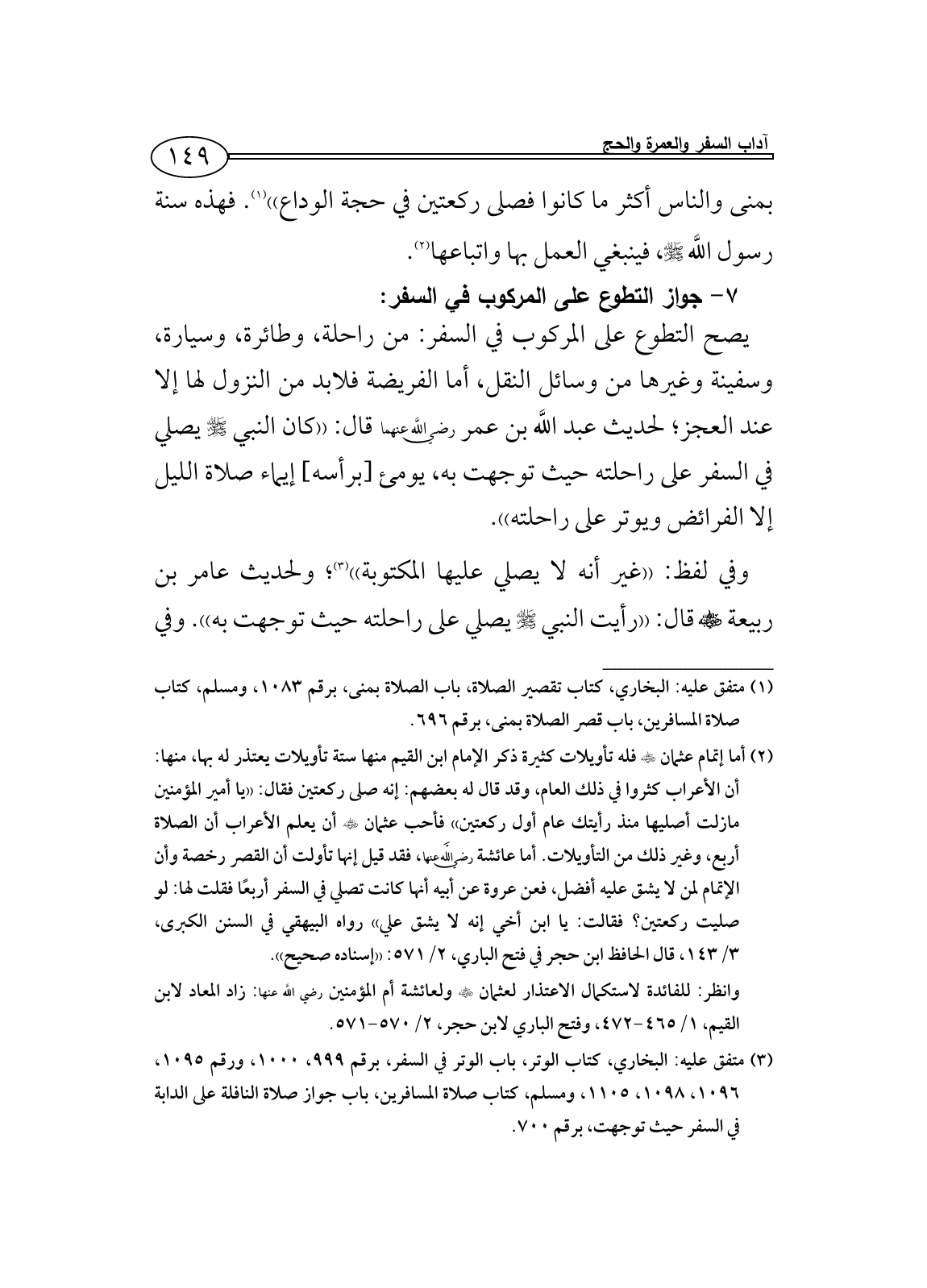 (¬3) متفق عليه: البخاري، كتاب الوتر، باب الوتر في السفر، برقم 999، 1000، ورقم 1095، 1096، 1098، 1105، ومسلم، كتاب صلاة المسافرين، باب جواز صلاة النافلة على الدابة في السفر حيث توجهت، برقم 700.