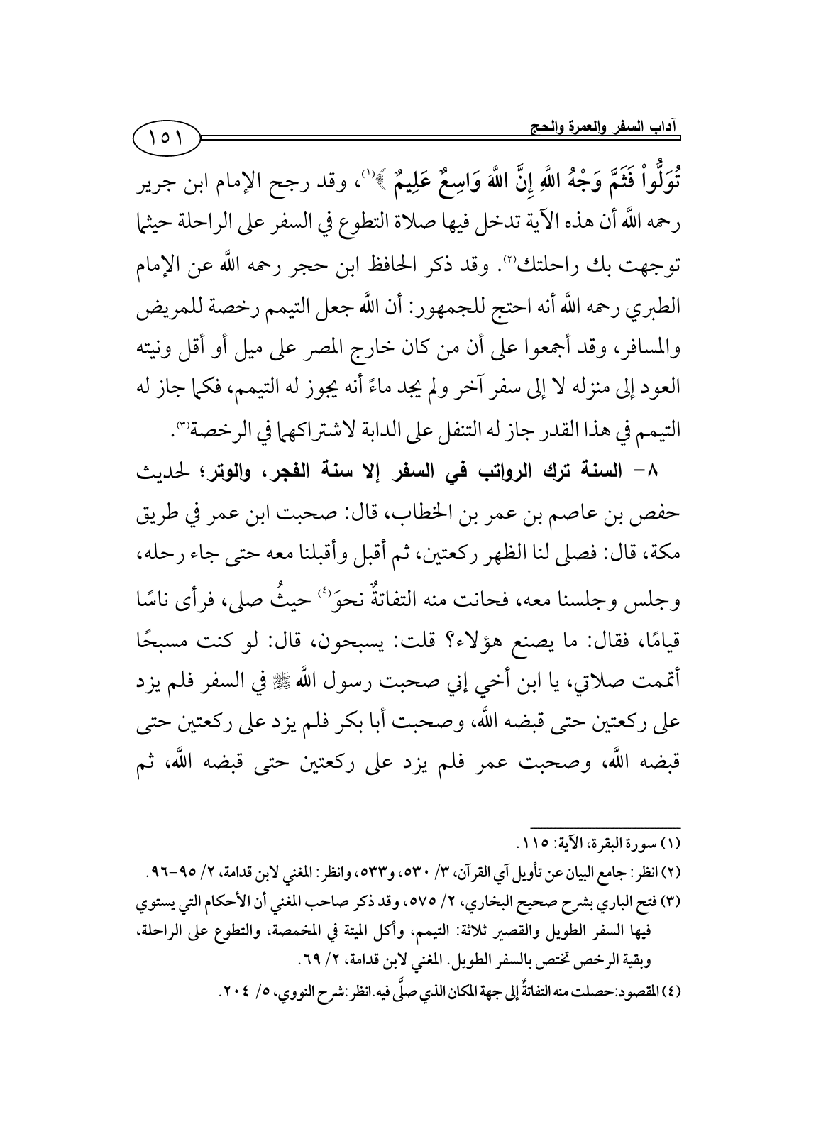 تُوَلُّواْ فَثَمَّ وَجْهُ اللَّهِ إِنَّ اللَّهَ وَاسِعٌ عَلِيمٌ} (¬1)، وقد رجح الإمام ابن جرير رحمه اللَّه أن هذه الآية تدخل فيها صلاة التطوع في السفر على الراحلة حيثما توجهت بك راحلتك (¬2). وقد ذكر الحافظ ابن حجر رحمه اللَّه عن الإمام الطبري رحمه اللَّه أنه احتج للجمهور: أن اللَّه جعل التيمم رخصة للمريض والمسافر، وقد أجمعوا على أن من كان خارج المصر على ميل أو أقل ونيته العود إلى منزله لا إلى سفر آخر ولم يجد ماءً أنه يجوز له التيمم، فكما جاز له التيمم في هذا القدر جاز له التنفل على الدابة لاشتراكهما في الرخصة (¬3).