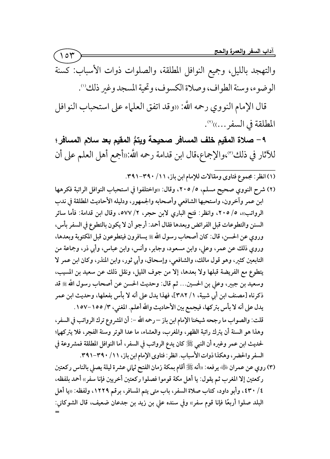 قلت: والصواب ما رجحه شيخنا الإمام ابن باز - رحمه اللَّه -: أن المشروع ترك الرواتب في السفر، وهذا هو السنة أن يترك راتبة الظهر، والمغرب، والعشاء، ما عدا الوتر وسنة الفجر، فلا يتركهما؛ لحديث ابن عمر وغيره أن النبي - صلى الله عليه وسلم - كان يدع الرواتب في السفر، أما النوافل المطلقة فمشروعة في السفر والحضر، وهكذا ذوات الأسباب. انظر: فتاوى الإمام ابن باز، 11/ 390 - 391.