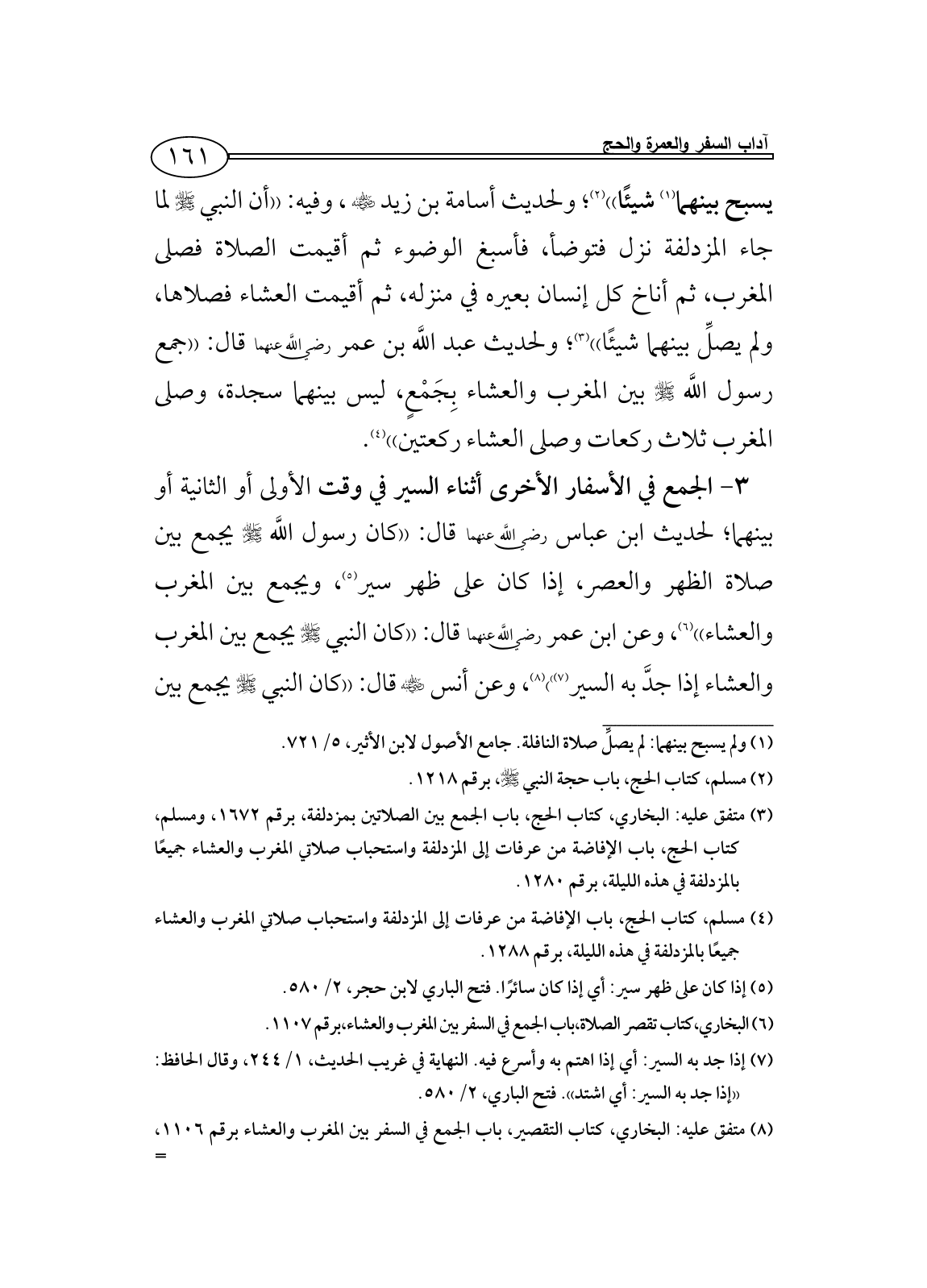 (¬8) متفق عليه: البخاري، كتاب التقصير، باب الجمع في السفر بين المغرب والعشاء برقم 1106، ومسلم، كتاب صلاة المسافرين، باب جواز الجمع بين الصلاتين في السفر، برقم 703.
