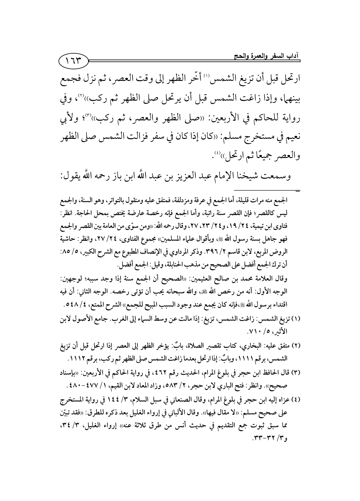 (¬4) عزاه إليه ابن حجر في بلوغ المرام، وقال الصنعاني في سبل السلام، 3/ 144 في رواية المستخرج على صحيح مسلم: ((لا مقال فيها)). وقال الألباني في إرواء الغليل بعد ذكره للطرق: ((فقد تبيّن مما سبق ثبوت جمع التقديم في حديث أنس من طرق ثلاثة عنه)) إرواء الغليل، 3/ 34، و3/ 32 - 33.