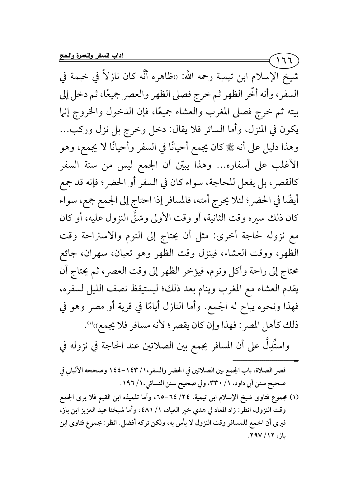 (¬1) مجموع فتاوى شيخ الإسلام ابن تيمية، 24/ 64 - 65، وأما تلميذه ابن القيم فلا يرى الجمع وقت النزول، انظر: زاد المعاد في هدي خير العباد، 1/ 481، وأما شيخنا عبد العزيز ابن باز، فيرى أن الجمع للمسافر وقت النزول لا بأس به، ولكن تركه أفضل. انظر: مجموع فتاوى ابن باز، 12/ 297.