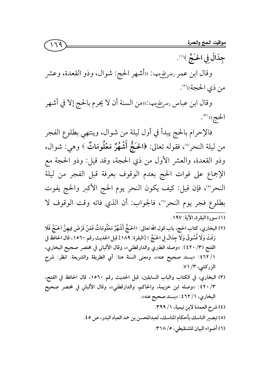(¬2) البخاري، كتاب الحج، باب قول اللَّه تعالى: {الحَجُّ أَشْهُرٌ مَعْلُومَاتٌ فَمَنْ فَرَضَ فِيهِنَّ الحَجَّ فَلَا رَفَثَ وَلَا فُسُوقَ وَلَا جِدَالَ فِي الحَجِّ} [البقرة: 189] قبل الحديث رقم 1560، قال الحافظ في الفتح (3/ 420): ((وصله الطبري والدارقطني))، وقال الألباني في مختصر صحيح البخاري، 1/ 462: ((بسند صحيح عنه))، ومعنى السنة هنا: أي الطريقة والشريعة. انظر: شرح الزركشي، 3/ 71.