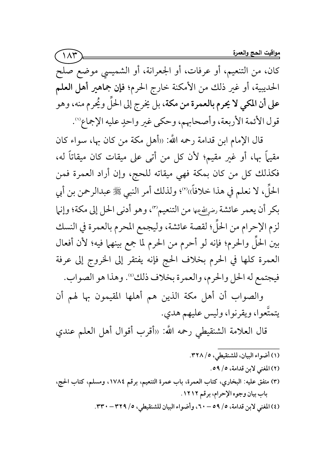 قال الإمام ابن قدامة رحمه اللَّه: ((أهل مكة من كان بها، سواء كان مقيماً بها، أو غير مقيم؛ لأن كل من أتى على ميقات كان ميقاتاً له، فكذلك كل من كان بمكة فهي ميقاته للحج، وإن أراد العمرة فمن الحلِّ، لا نعلم في هذا خلافاً)) (¬2)؛ ولذلك أمر النبي - صلى الله عليه وسلم - عبد الرحمن بن أبي بكر أن يعمر عائشة رضي اللَّه عنها من التنعيم (¬3)، وهو أدنى الحل إلى مكة؛ وإنما لزم الإحرام من الحلِّ؛ لقصة عائشة، وليجمع المحرم بالعمرة في النسك