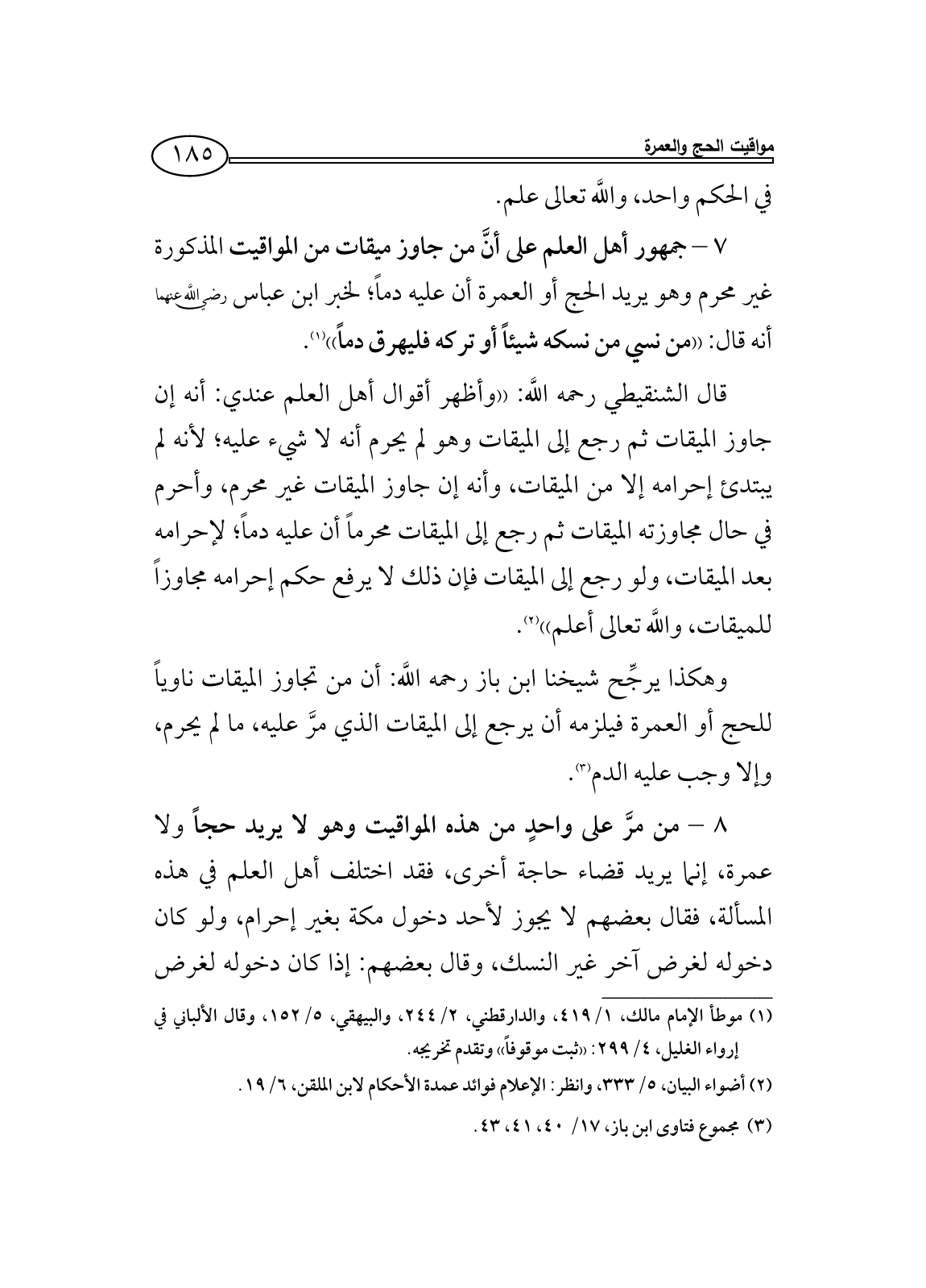 7 - جمهور أهل العلم على أنَّ من جاوز ميقات من المواقيت المذكورة غير محرم وهو يريد الحج أو العمرة أن عليه دماً؛ لخبر ابن عباس رضي اللَّه عنهما أنه قال: ((من نسي من نسكه شيئاً أو تركه فليهرق دماً)) (¬1).