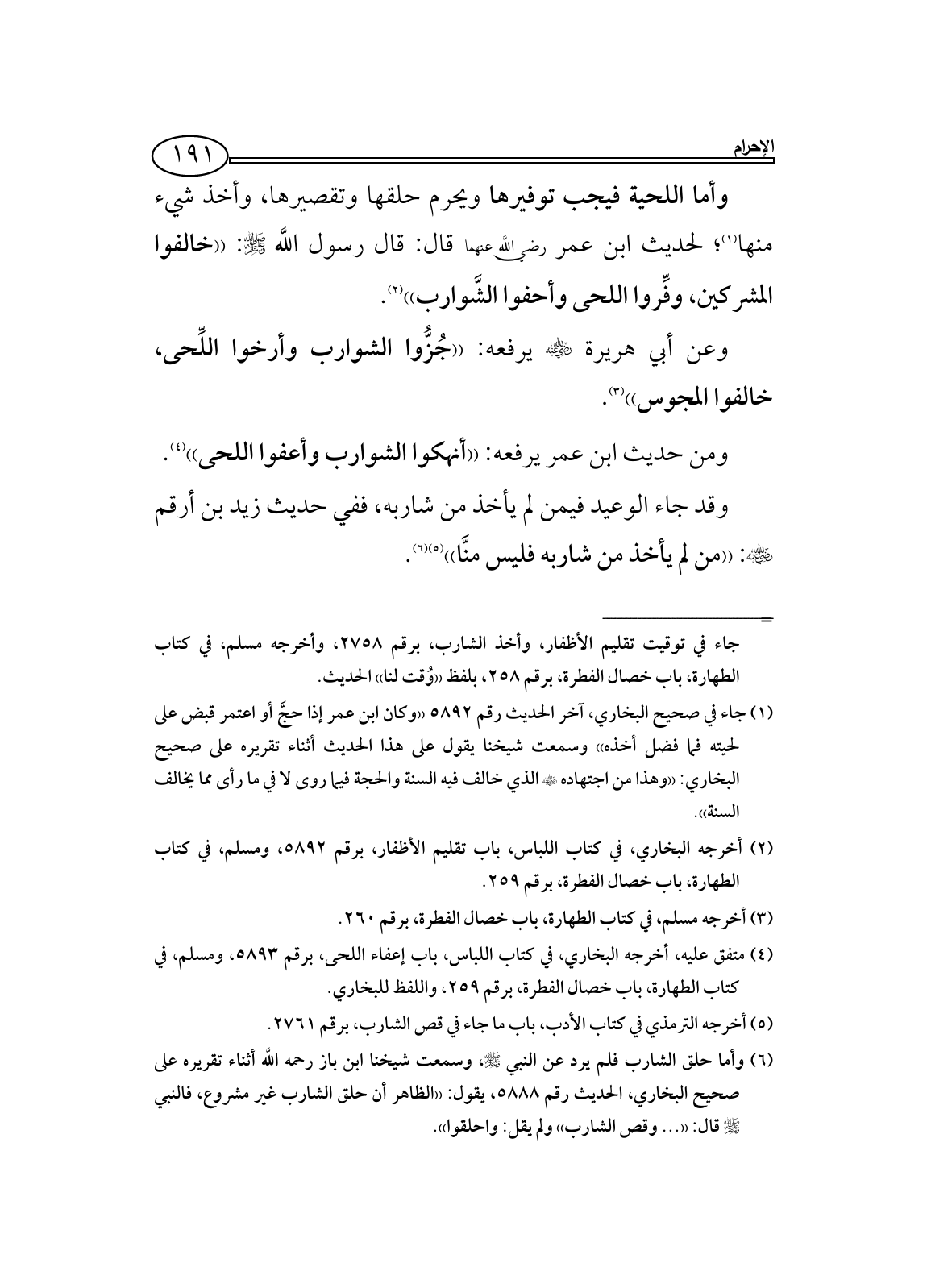 (¬1) جاء في صحيح البخاري، آخر الحديث رقم 5892 ((وكان ابن عمر إذا حجَّ أو اعتمر قبض على لحيته فما فضل أخذه)) وسمعت شيخنا يقول على هذا الحديث أثناء تقريره على صحيح البخاري: ((وهذا من اجتهاده - رضي الله عنه - الذي خالف فيه السنة والحجة فيما روى لا في ما رأى مما يخالف السنة)).