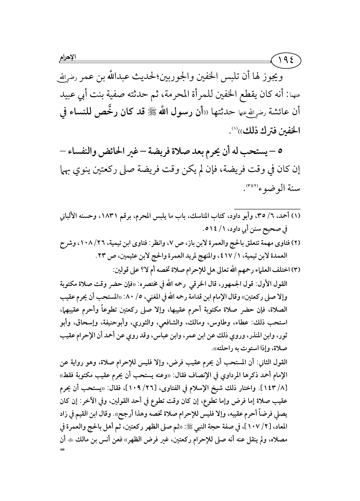 17/ 69: ((وهذا يدل على مشروعية صلاة الركعتين، وهذا قول جمهور أهل العلم. وقال آخرون: ليس في هذا نص)) وقال: ((يحتمل أن المراد صلاة الفريضة ... وليس بنص في ركعتي الإحرام، وكونه أحرم بعد فريضة لا يدل على شرعية ركعتين خاصة)). وسمعته يقول أثناء تقريره على صحيح البخاري، الحديث رقم 2337: ((ولا بأس أن يصلي سنة الوضوء بعده جمعاً بين القولين قبل الإحرام))، وذكر العلامة محمد بن صالح العثيمين في الشرح الممتع، 7/ 77: أنه إذا أمكن أن يحرم بعد صلاة فريضة فهو المشروع، أو يصلي صلاة الضحى إن كان في الضحى، أو سنة الوضوء إذا توضأ، وإن بقي في الميقات إلى وقت فريضة فالأفضل أن يهل بعد فريضة.