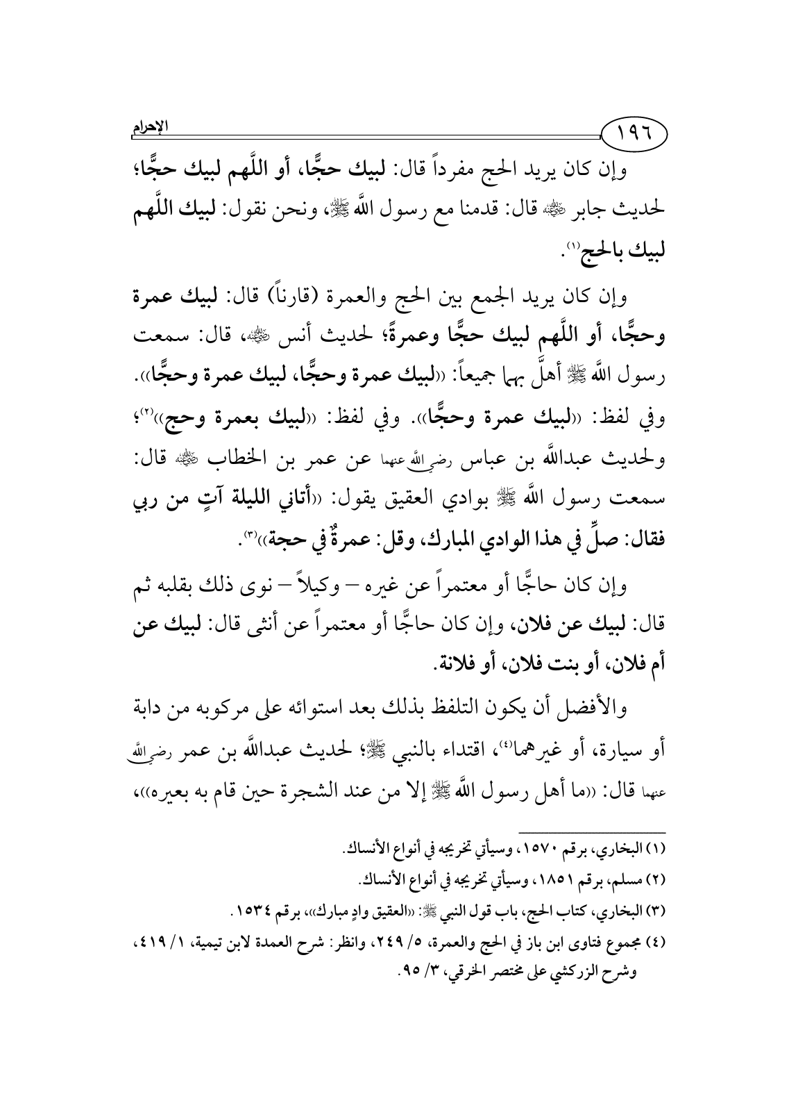 وإن كان يريد الجمع بين الحج والعمرة (قارناً) قال: لبيك عمرة وحجًّا، أو اللَّهم لبيك حجًّا وعمرةً؛ لحديث أنس - رضي الله عنه -، قال: سمعت رسول اللَّه - صلى الله عليه وسلم - أهلَّ بهما جميعاً: ((لبيك عمرة وحجًّا، لبيك عمرة وحجًّا)). وفي لفظ: ((لبيك عمرة وحجًّا)). وفي لفظ: ((لبيك بعمرة وحج)) (¬2)؛ ولحديث عبد اللَّه بن عباس رضي اللَّه عنهما عن عمر بن الخطاب - رضي الله عنه - قال: سمعت رسول اللَّه - صلى الله عليه وسلم - بوادي العقيق يقول: ((أتاني الليلة آتٍ من ربي فقال: صلِّ في هذا الوادي المبارك، وقل: عمرةٌ في حجة)) (¬3).