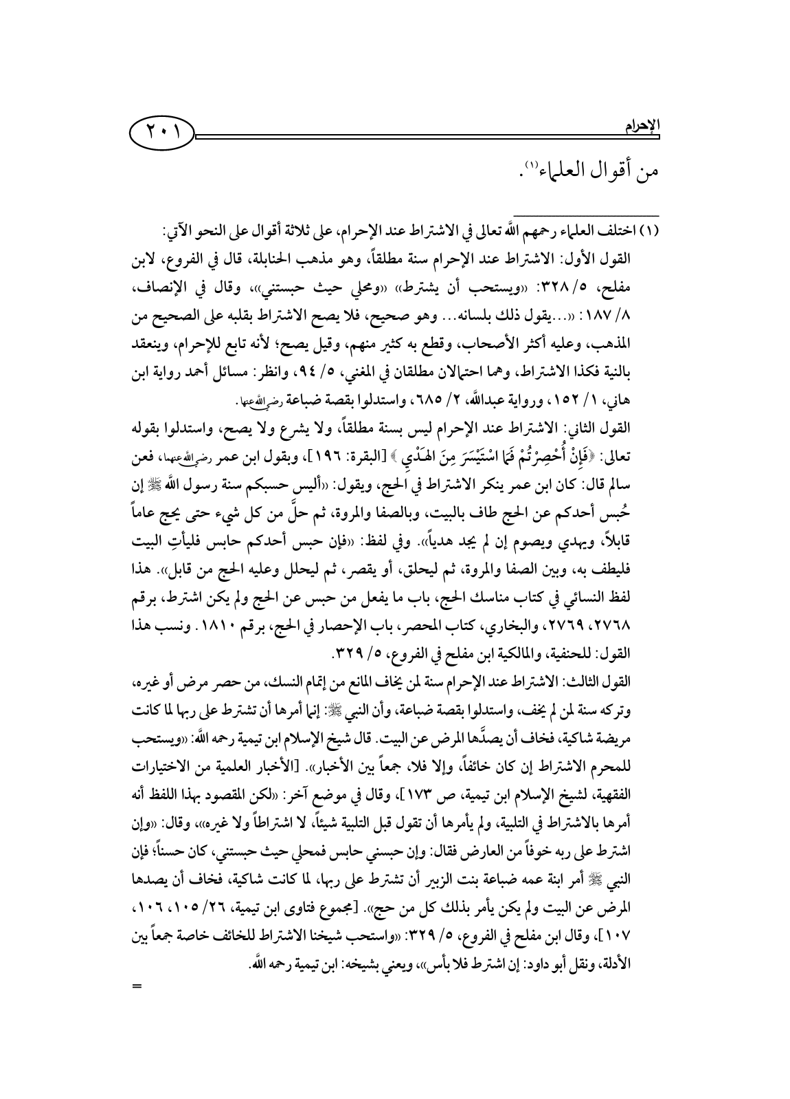 (¬1) اختلف العلماء رحمهم اللَّه تعالى في الاشتراط عند الإحرام، على ثلاثة أقوال على النحو الآتي: