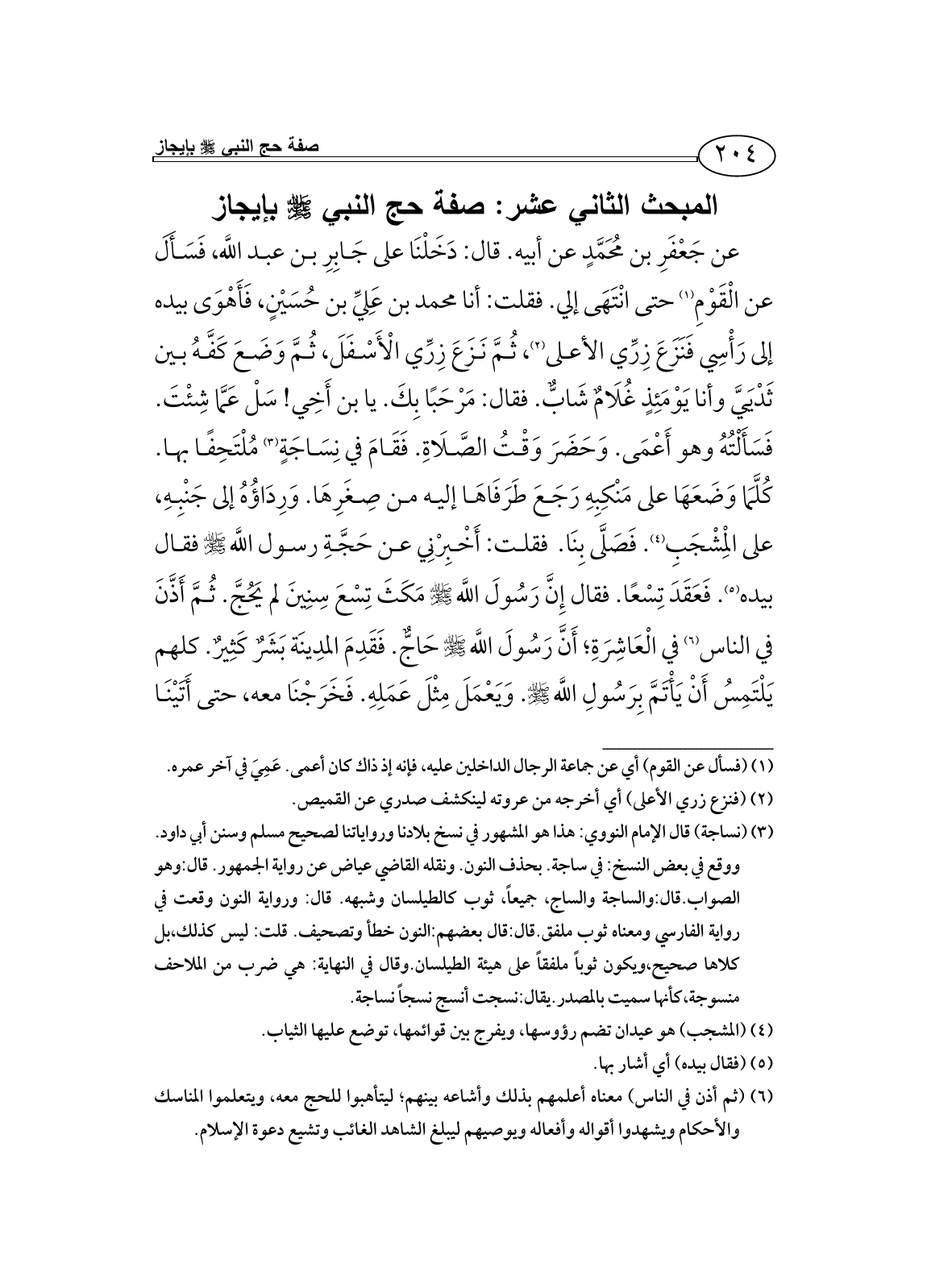 عن جَعْفَرِ بن مُحَمَّدٍ عن أبيه. قال: دَخَلْنَا على جَابِرِ بن عبد اللَّه، فَسَأَلَ عن الْقَوْمِ (¬1) حتى انْتَهَى إلي. فقلت: أنا محمد بن عَلِيِّ بن حُسَيْنٍ، فَأَهْوَى بيده إلى رَأْسِي فَنَزَعَ زِرِّي الأعلى (¬2)، ثُمَّ نَزَعَ زِرِّي الْأَسْفَلَ، ثُمَّ وَضَعَ كَفَّهُ بين ثَدْيَيَّ وأنا يَوْمَئِذٍ غُلَامٌ شَابٌّ. فقال: مَرْحَبًا بِكَ. يا بن أَخِي! سَلْ عَمَّا شِئْتَ. فَسَأَلْتُهُ وهو أَعْمَى. وَحَضَرَ وَقْتُ الصَّلَاةِ. فَقَامَ في نِسَاجَةٍ (¬3) مُلْتَحِفًا بها. كُلَّمَا وَضَعَهَا على مَنْكِبِهِ رَجَعَ طَرَفَاهَا إليه من صِغَرِهَا. وَرِدَاؤُهُ إلى جَنْبِهِ، على الْمِشْجَبِ (¬4). فَصَلَّى بِنَا. فقلت: أَخْبِرْنِي عن حَجَّةِ رسول اللَّه - صلى الله عليه وسلم - فقال بيده (¬5). فَعَقَدَ تِسْعًا. فقال إِنَّ رَسُولَ اللَّه - صلى الله عليه وسلم - مَكَثَ تِسْعَ سِنِينَ لم يَحُجَّ. ثُمَّ أَذَّنَ في الناس (¬6) في الْعَاشِرَةِ؛ أَنَّ رَسُولَ اللَّه - صلى الله عليه وسلم - حَاجٌّ. فَقَدِمَ المدِينَة بَشَرٌ كَثِيرٌ. كلهم يَلْتَمِسُ أَنْ يَأْتَمَّ بِرَسُولِ اللَّه - صلى الله عليه وسلم -. وَيَعْمَلَ مِثْلَ عَمَلِهِ. فَخَرَجْنَا معه، حتى أَتَيْنَا
