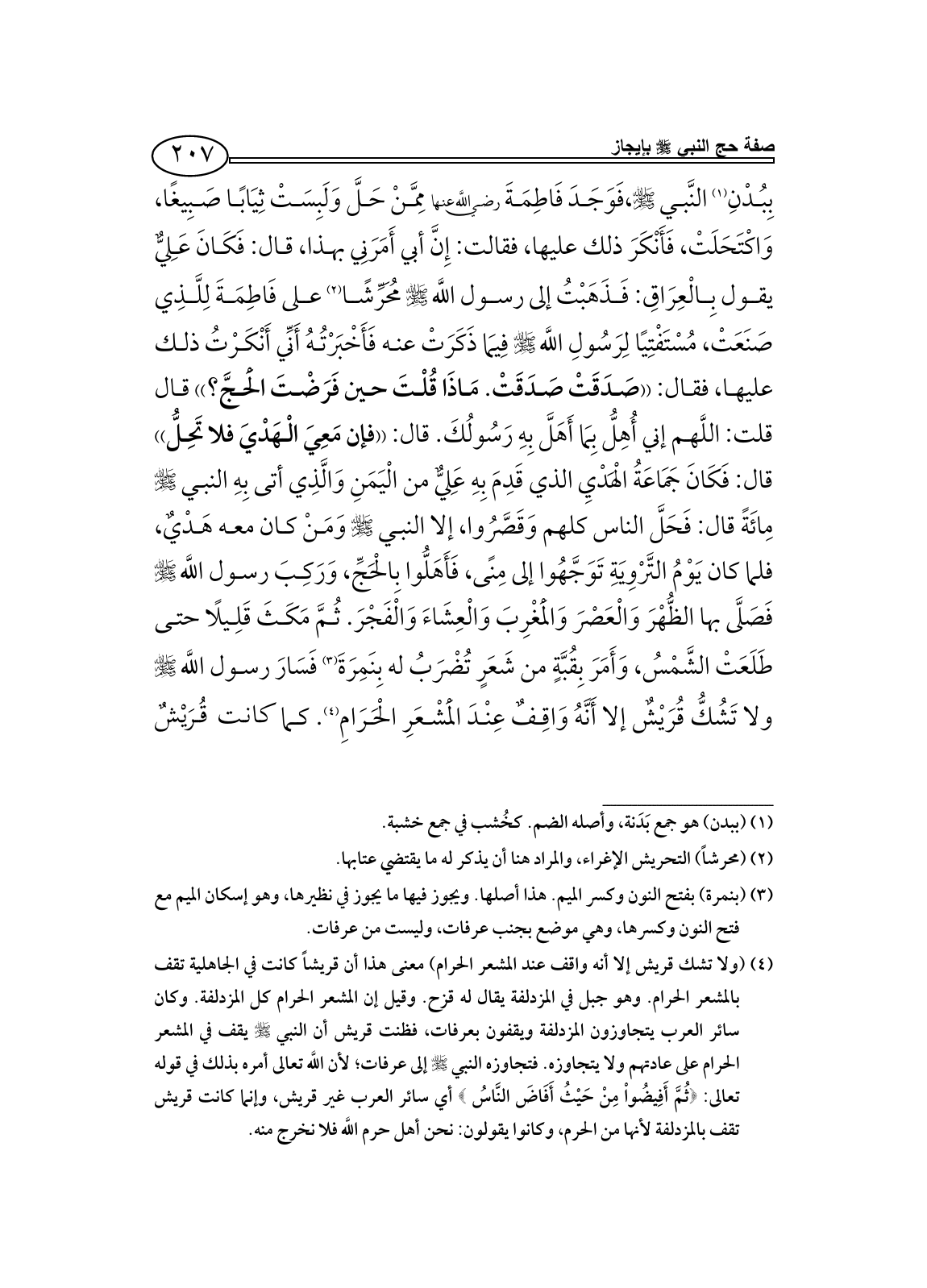 بِبُدْنِ (¬1) النَّبي - صلى الله عليه وسلم -،فَوَجَدَ فَاطِمَةَ رضي اللَّه عنها مِمَّنْ حَلَّ وَلَبِسَتْ ثِيَابًا صَبِيغًا، وَاكْتَحَلَتْ، فَأَنْكَرَ ذلك عليها، فقالت: إِنَّ أبي أَمَرَنِي بهذا، قال: فَكَانَ عَلِيٌّ يقول بِالْعِرَاقِ: فَذَهَبْتُ إلى رسول اللَّه - صلى الله عليه وسلم - مُحَرِّشًا (¬2) على فَاطِمَةَ لِلَّذِي صَنَعَتْ، مُسْتَفْتِيًا لِرَسُولِ اللَّه - صلى الله عليه وسلم - فِيمَا ذَكَرَتْ عنه فَأَخْبَرْتُهُ أَنِّي أَنْكَرْتُ ذلك عليها، فقال: ((صَدَقَتْ صَدَقَتْ. مَاذَا قُلْتَ حين فَرَضْتَ الْحَجَّ؟)) قال قلت: اللَّهم إني أُهِلُّ بِمَا أَهَلَّ بِهِ رَسُولُكَ. قال: ((فإن مَعِيَ الْهَدْيَ فلا تَحِلُّ)) قال: فَكَانَ جَمَاعَةُ الْهَدْيِ الذي قَدِمَ بِهِ عَلِيٌّ من الْيَمَنِ وَالَّذِي أتى بِهِ النبي - صلى الله عليه وسلم - مِائَةً قال: فَحَلَّ الناس كلهم وَقَصَّرُوا، إلا النبي - صلى الله عليه وسلم - وَمَنْ كان معه هَدْيٌ، فلما كان يَوْمُ التَّرْوِيَةِ تَوَجَّهُوا إلى مِنًى، فَأَهَلُّوا بِالْحَجِّ، وَرَكِبَ رسول اللَّه - صلى الله عليه وسلم - فَصَلَّى بها الظُّهْرَ وَالْعَصْرَ وَالْمَغْرِبَ وَالْعِشَاءَ وَالْفَجْرَ. ثُمَّ مَكَثَ قَلِيلًا حتى طَلَعَتْ الشَّمْسُ، وَأَمَرَ بِقُبَّةٍ من شَعَرٍ تُضْرَبُ له بِنَمِرَةَ (¬3) فَسَارَ رسول اللَّه - صلى الله عليه وسلم - ولا تَشُكُّ قُرَيْشٌ إلا أَنَّهُ وَاقِفٌ عِنْدَ الْمَشْعَرِ الْحَرَامِ (¬4). كما كانت قُرَيْشٌ